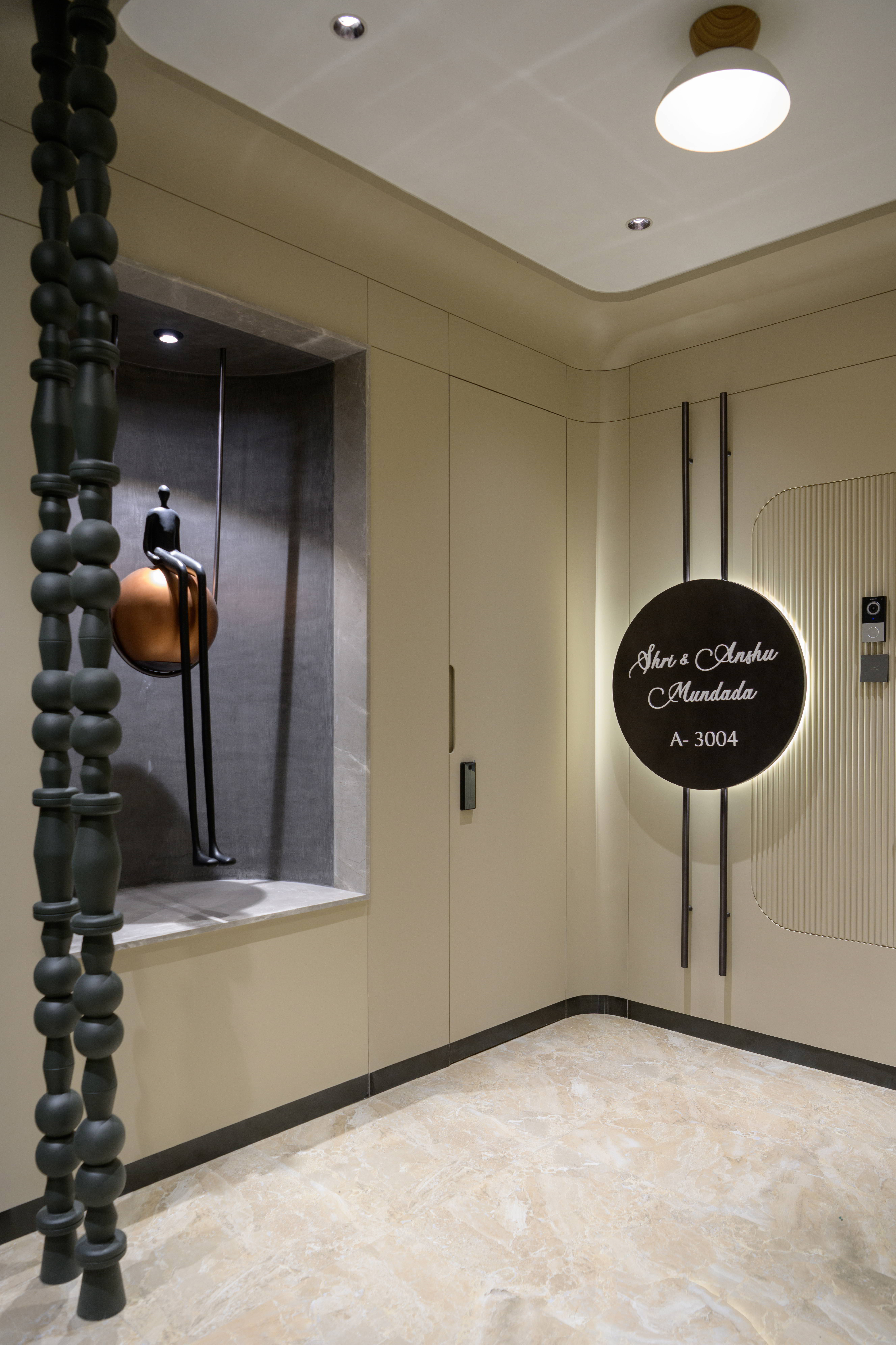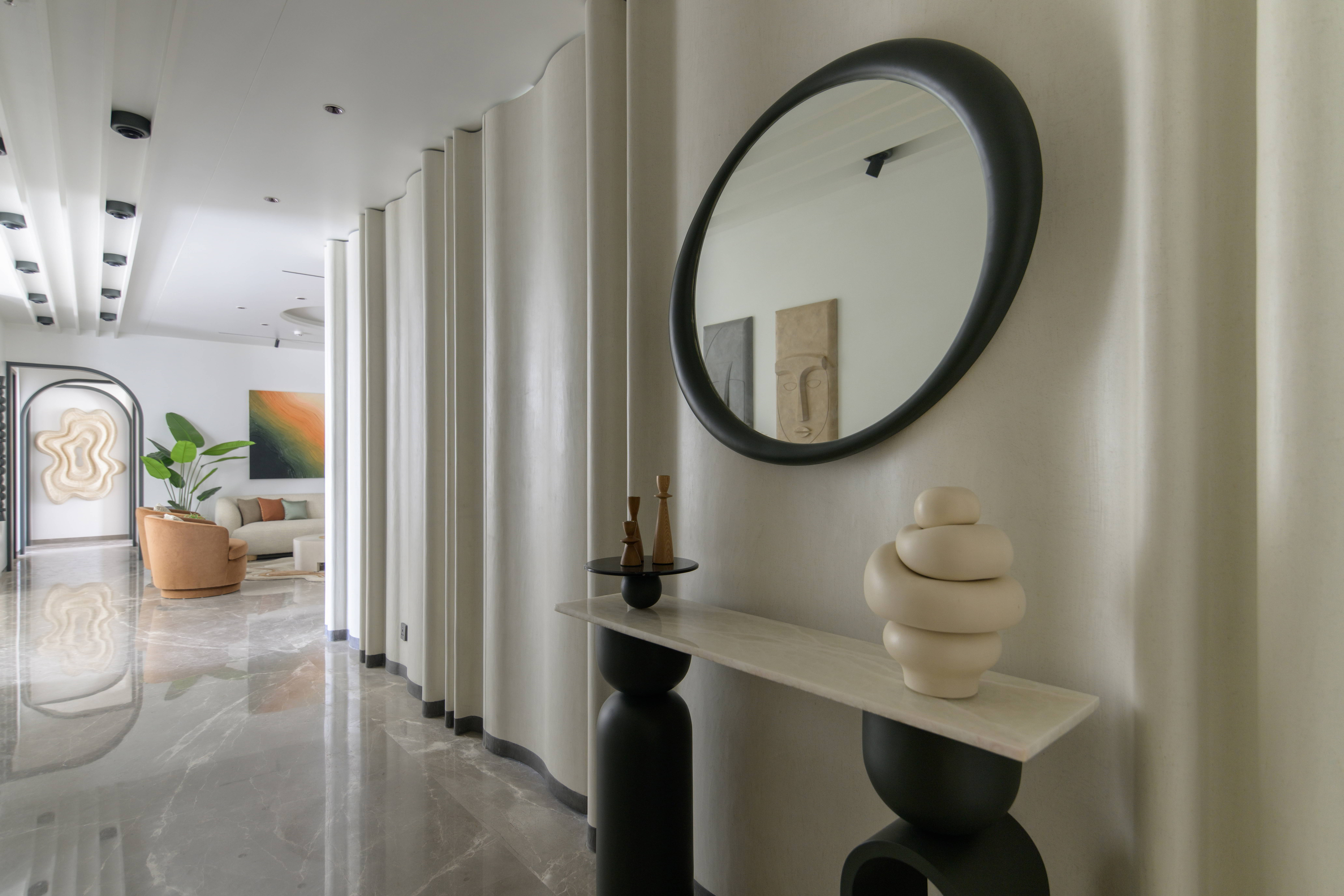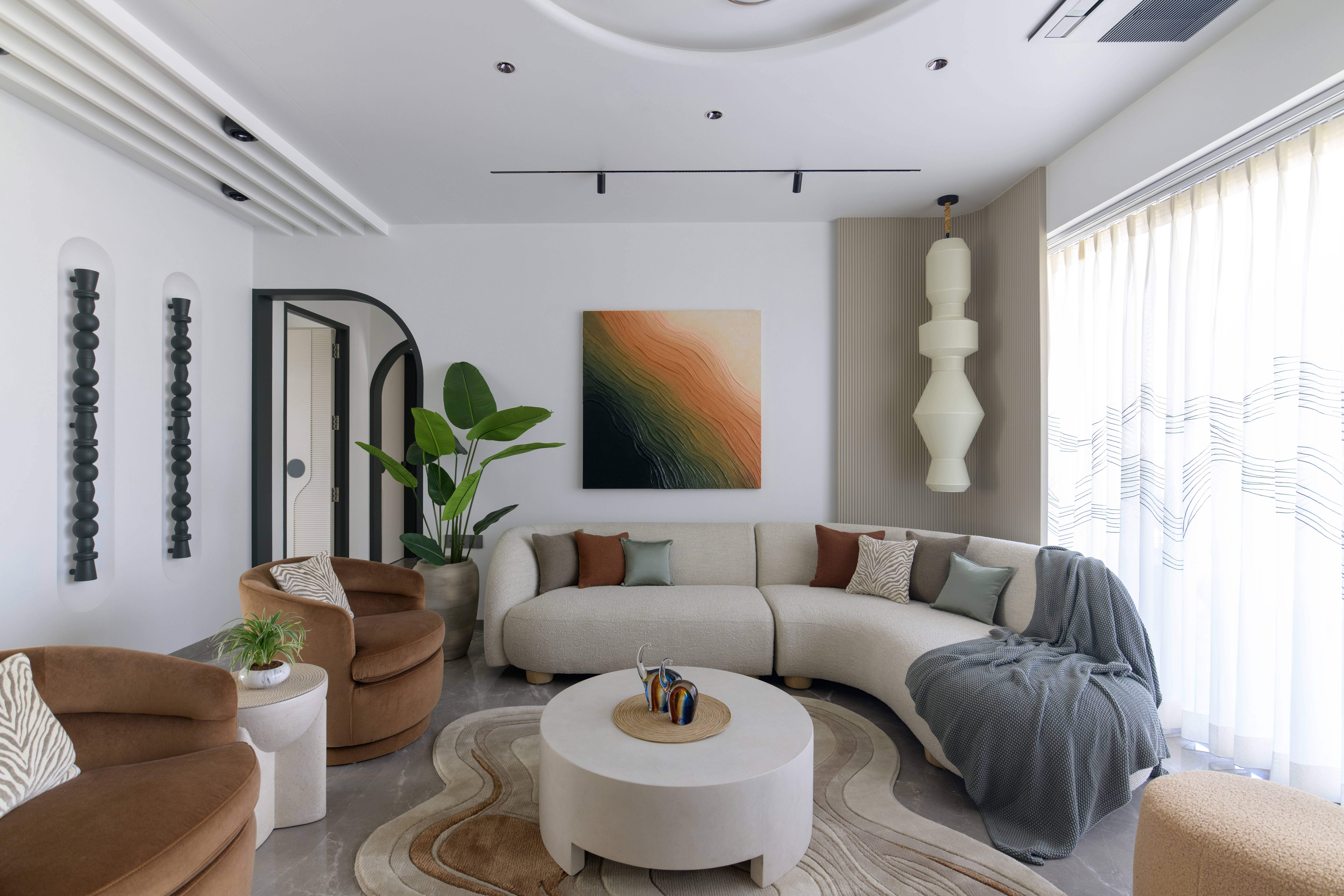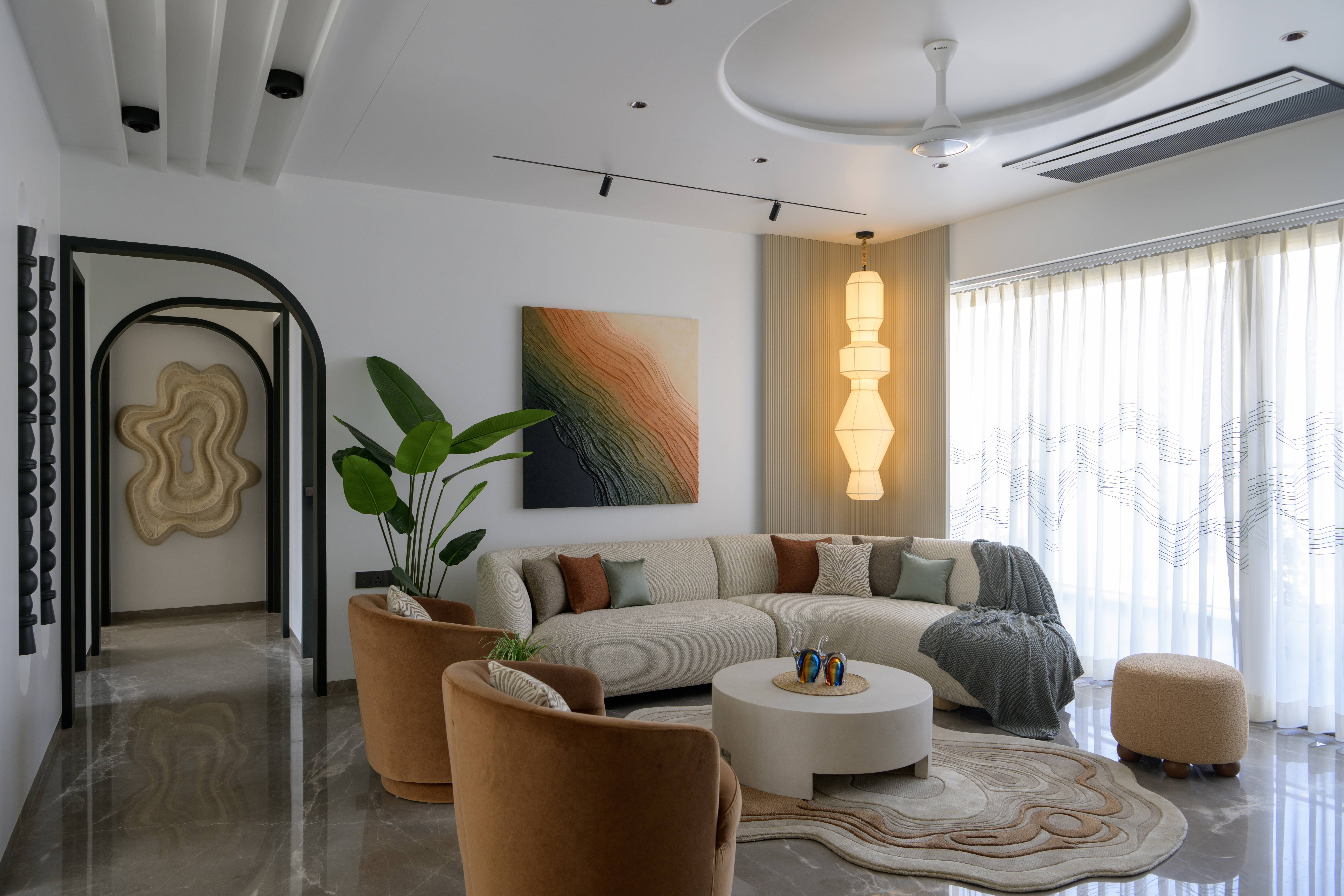 This contemporary residence is designed to feel calm, stylish, and welcoming. The overall concept blends clean lines, soft curves, and warm neutral tones to create a modern home with character. From the entrance lobby to the living room, every space is thoughtfully planned with a balance of comfort and elegance. Statement elements like sculptural partitions, custom wall details, and artistic décor add a unique identity to the interiors.