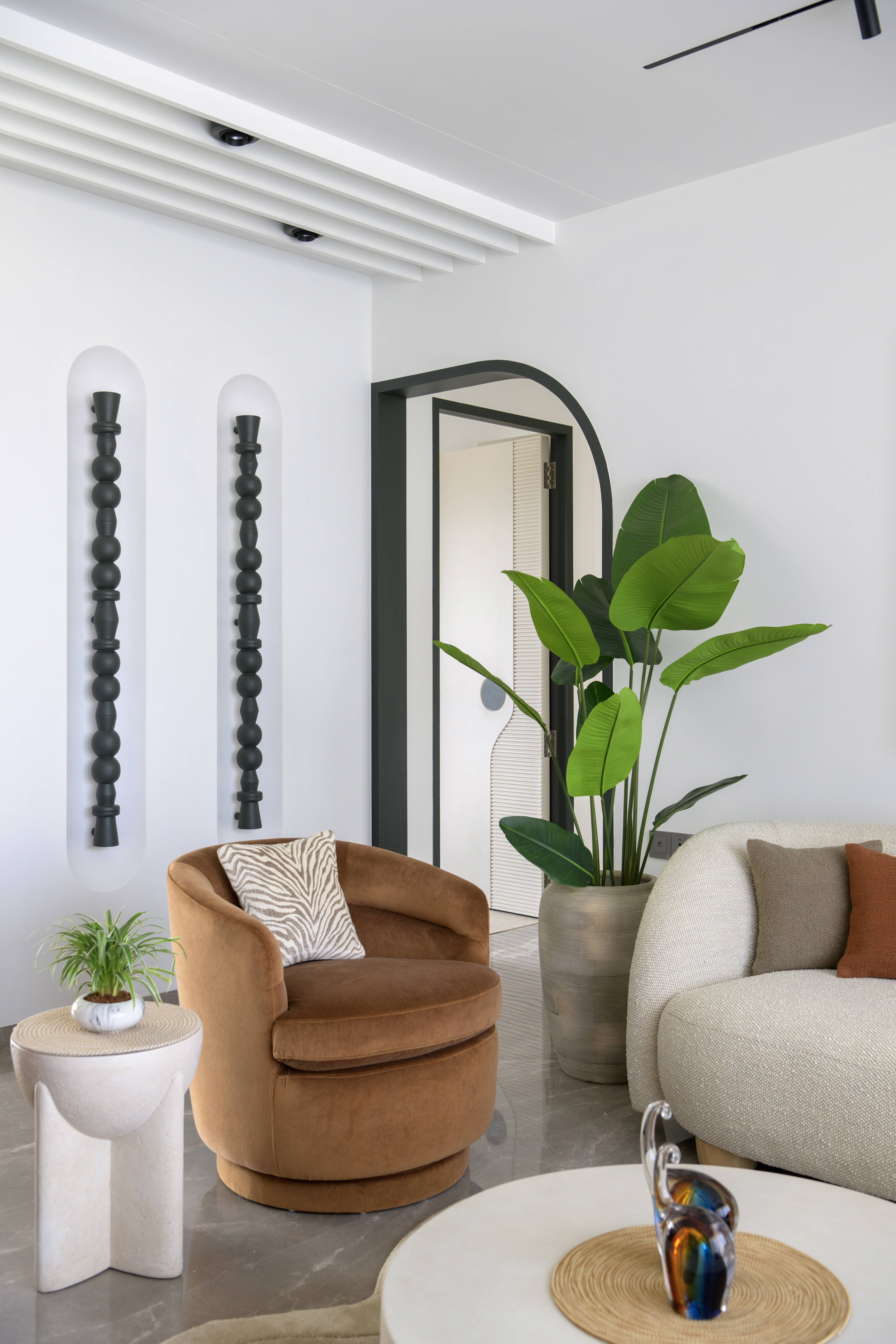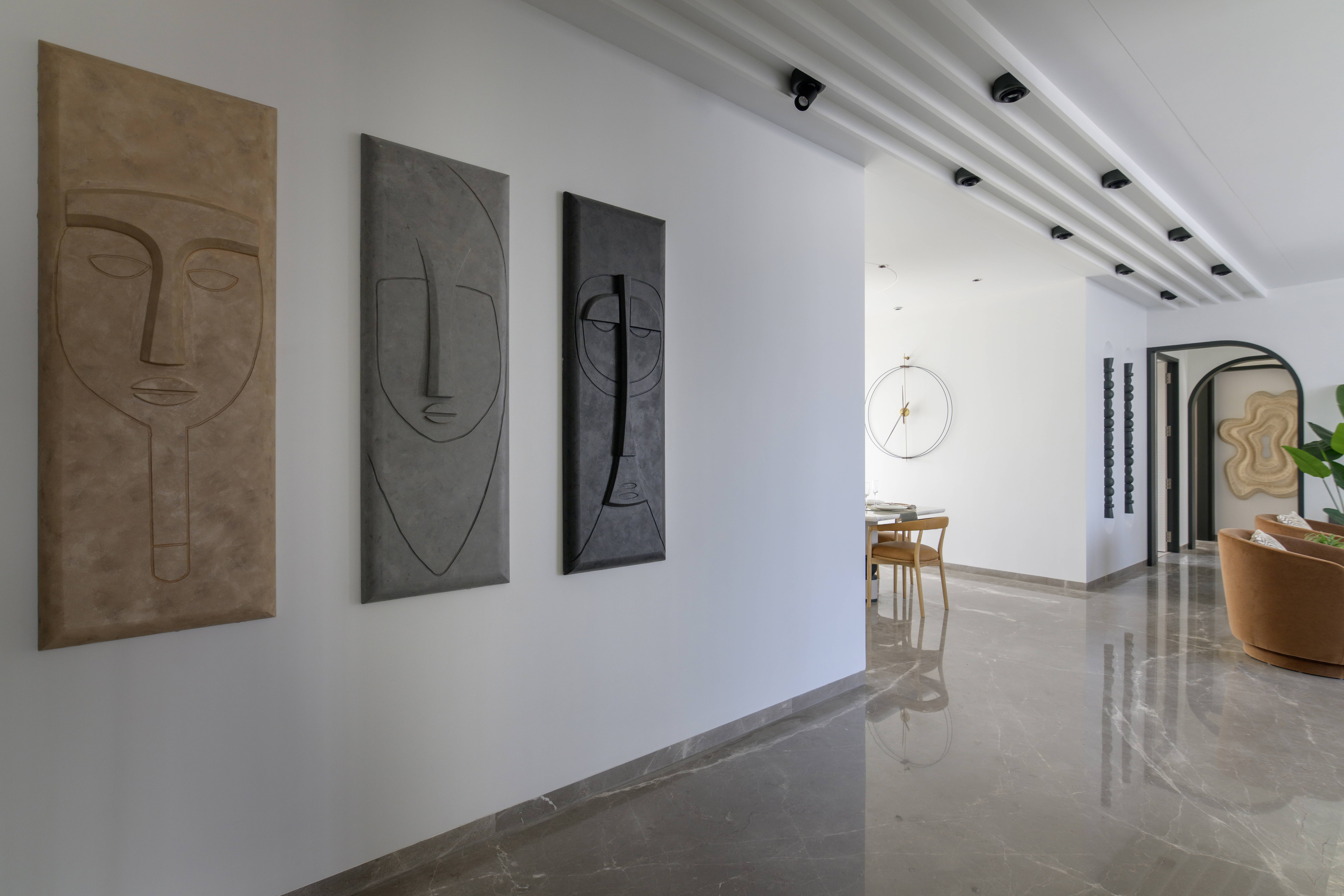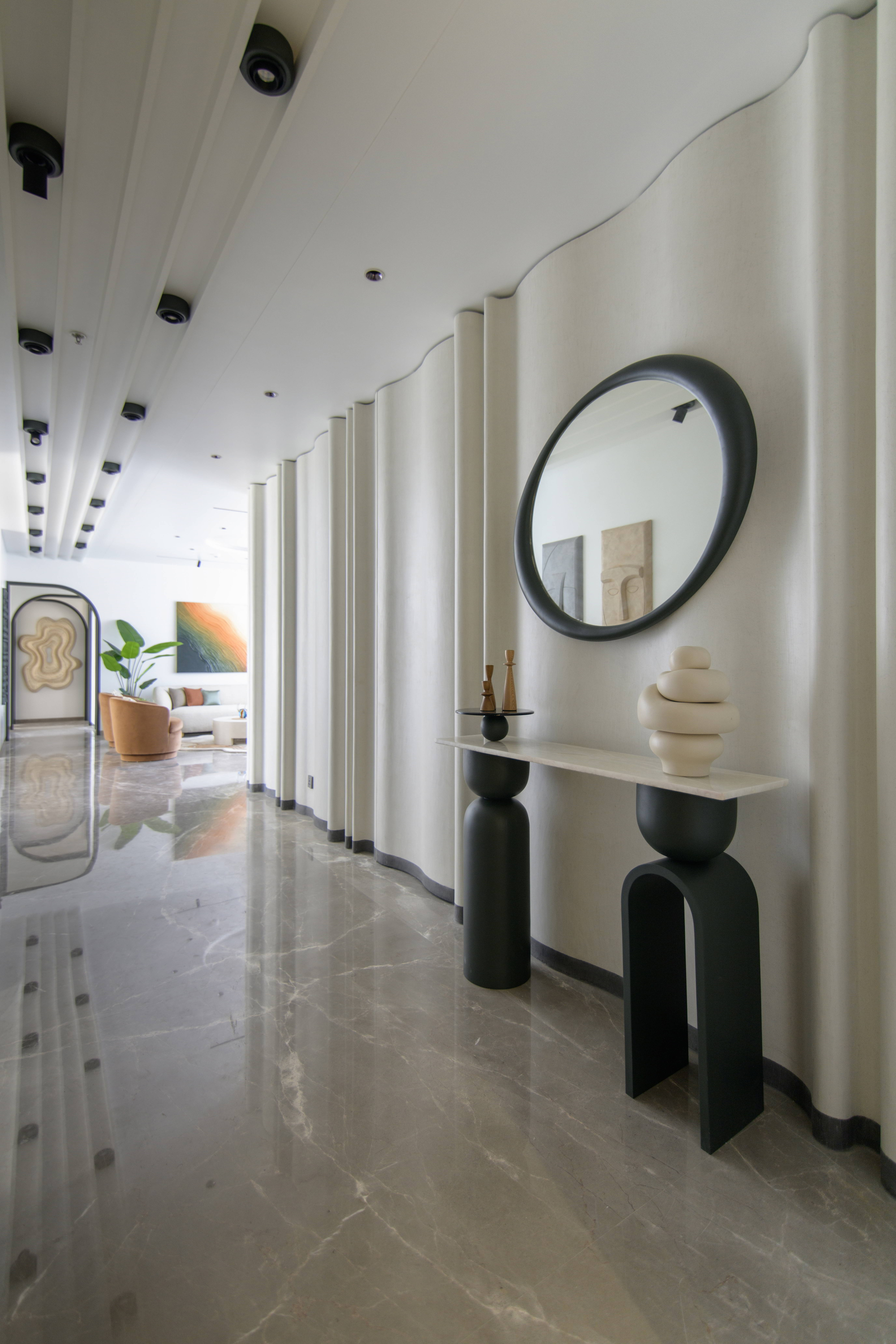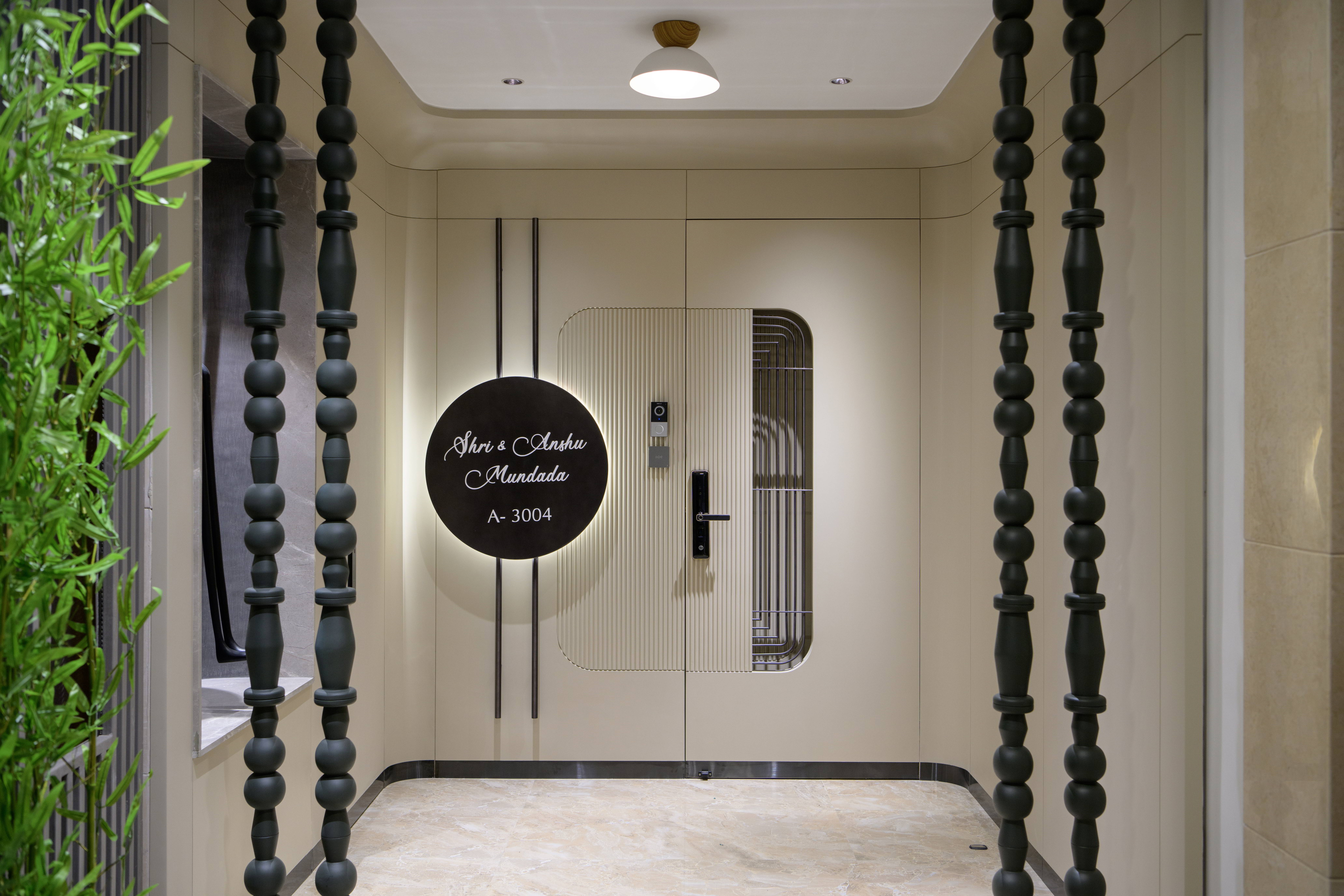 This contemporary residence is designed to feel calm, stylish, and welcoming. The overall concept blends clean lines, soft curves, and warm neutral tones to create a modern home with character. From the entrance lobby to the living room, every space is thoughtfully planned with a balance of comfort and elegance. Statement elements like sculptural partitions, custom wall details, and artistic décor add a unique identity to the interiors.