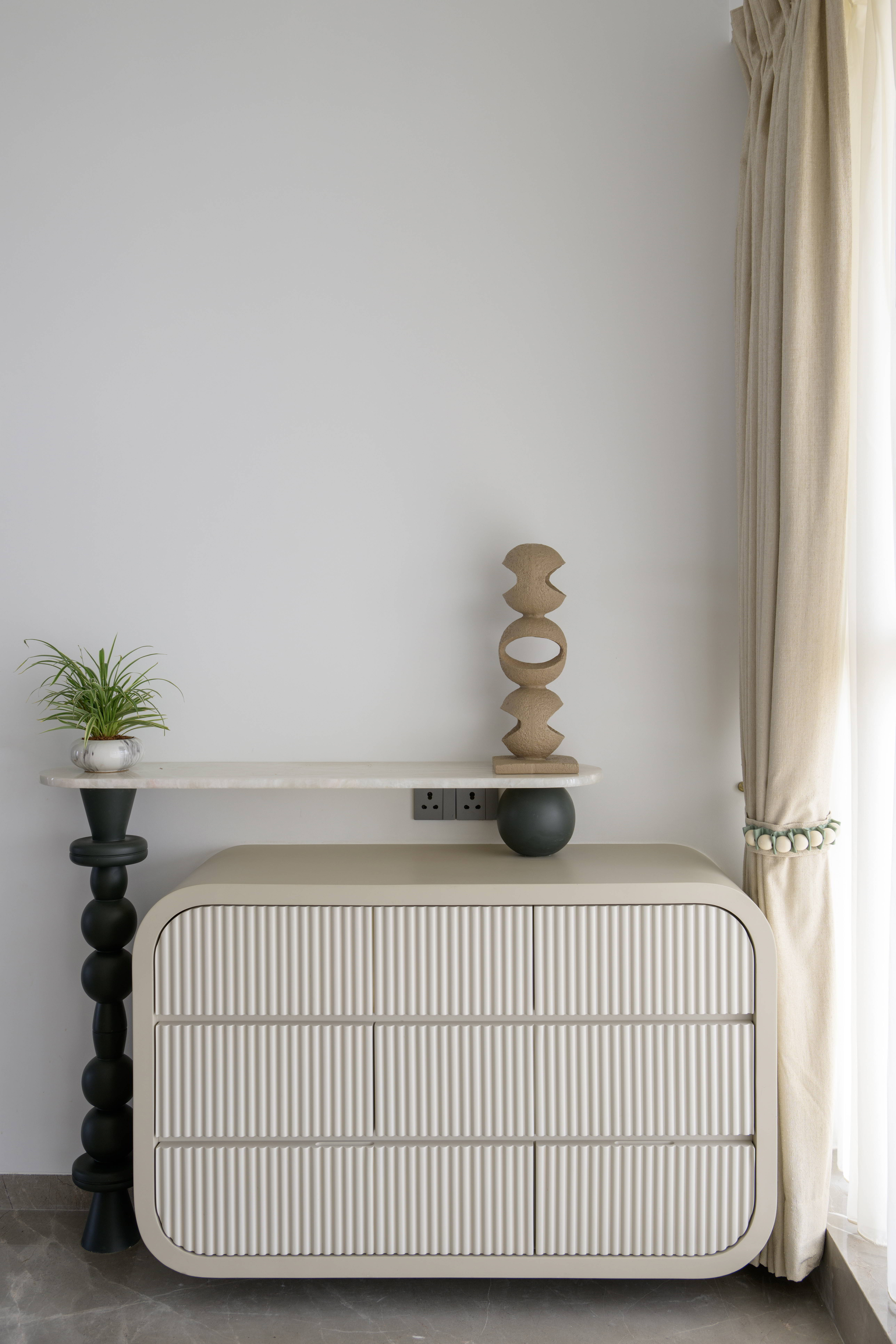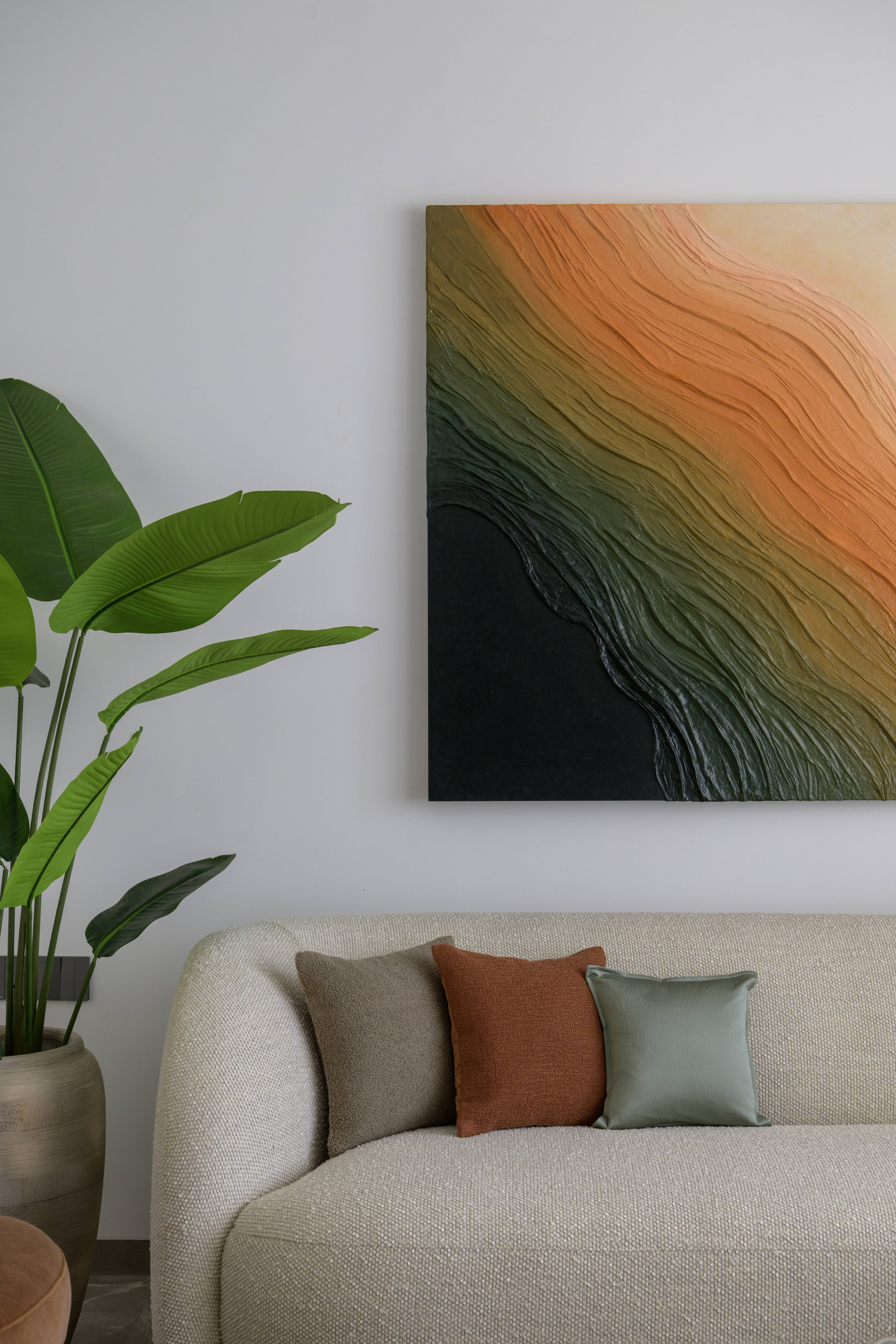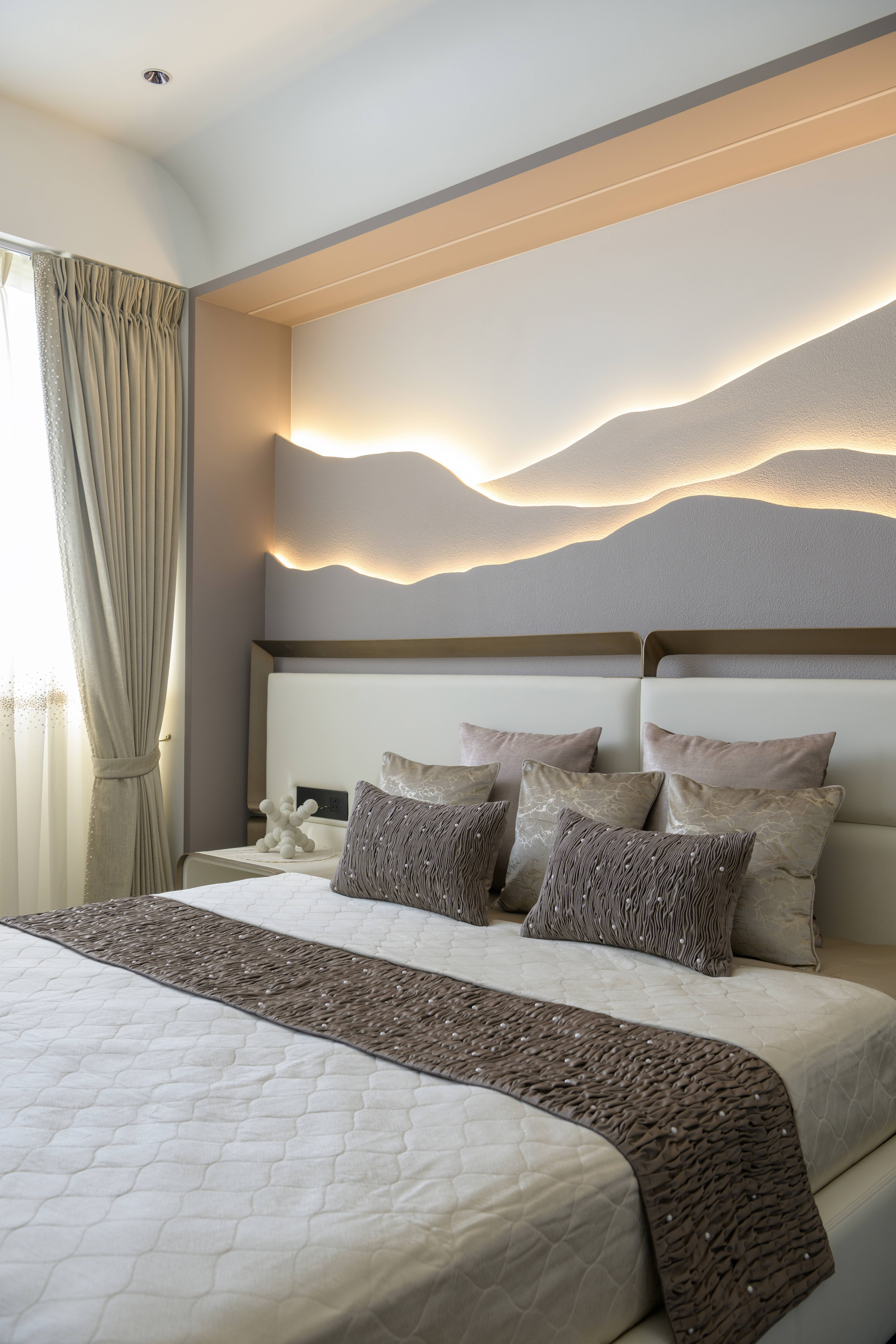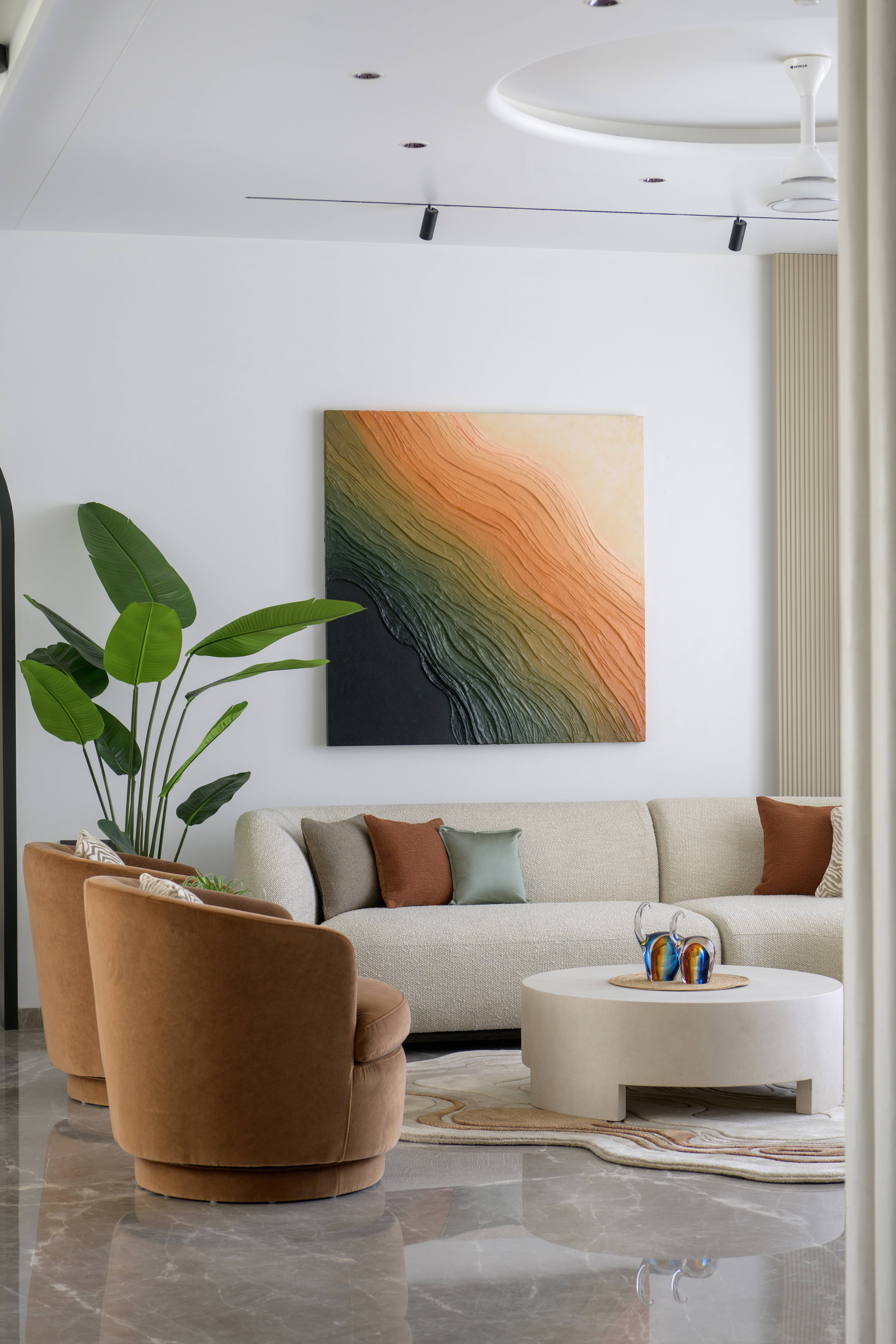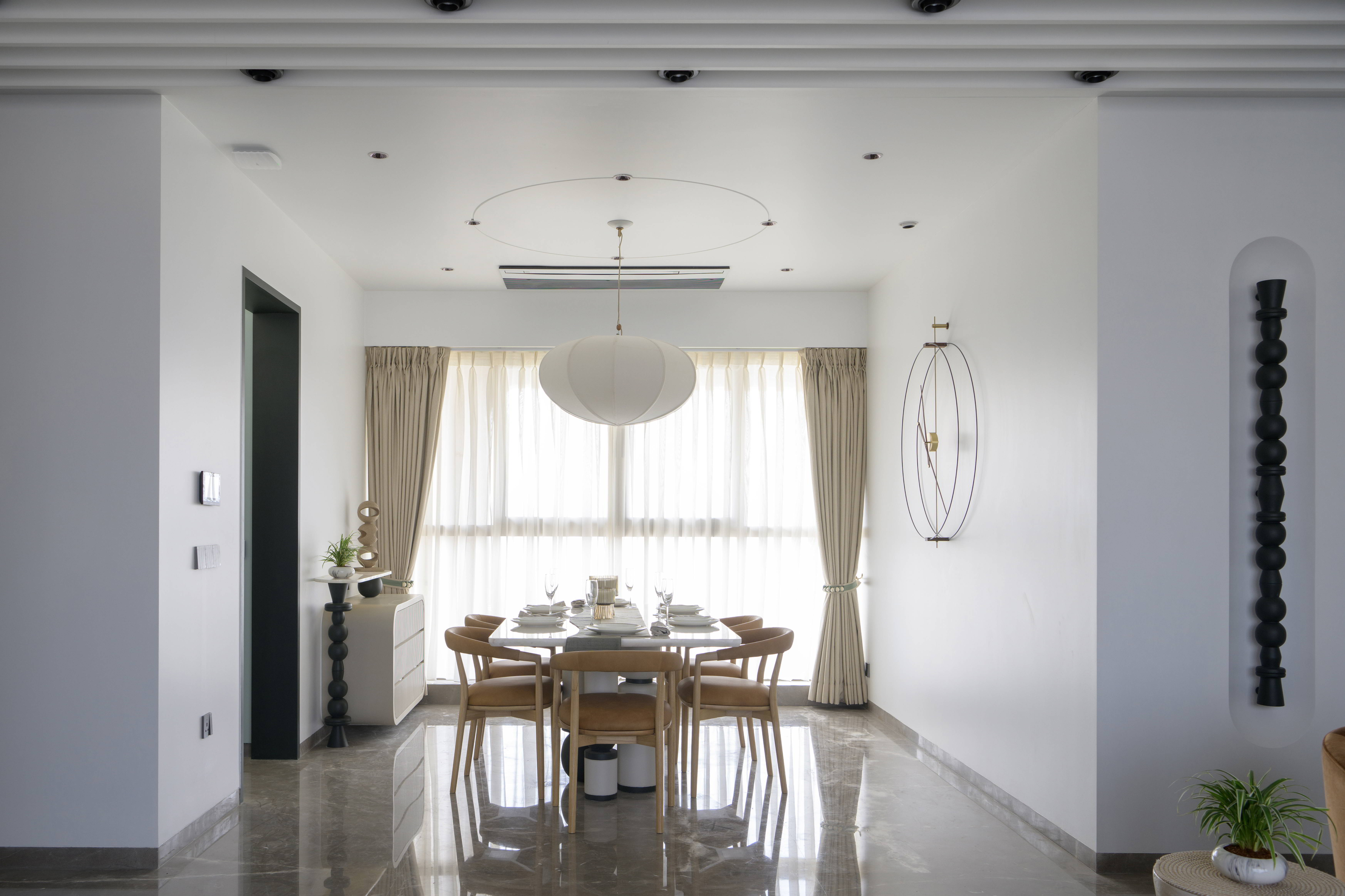 This contemporary residence is designed to feel calm, stylish, and welcoming. The overall concept blends clean lines, soft curves, and warm neutral tones to create a modern home with character. From the entrance lobby to the living room, every space is thoughtfully planned with a balance of comfort and elegance. Statement elements like sculptural partitions, custom wall details, and artistic décor add a unique identity to the interiors.