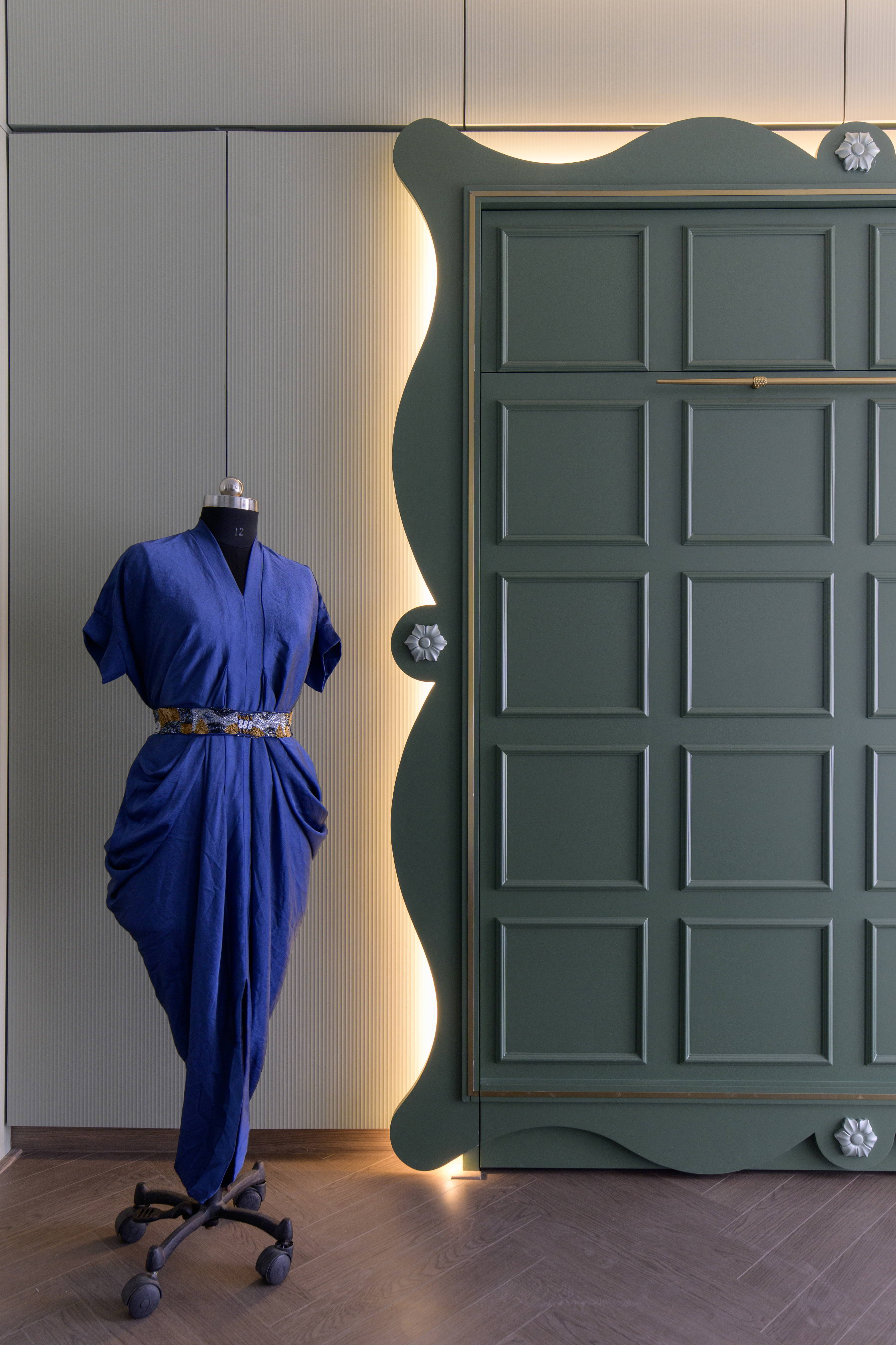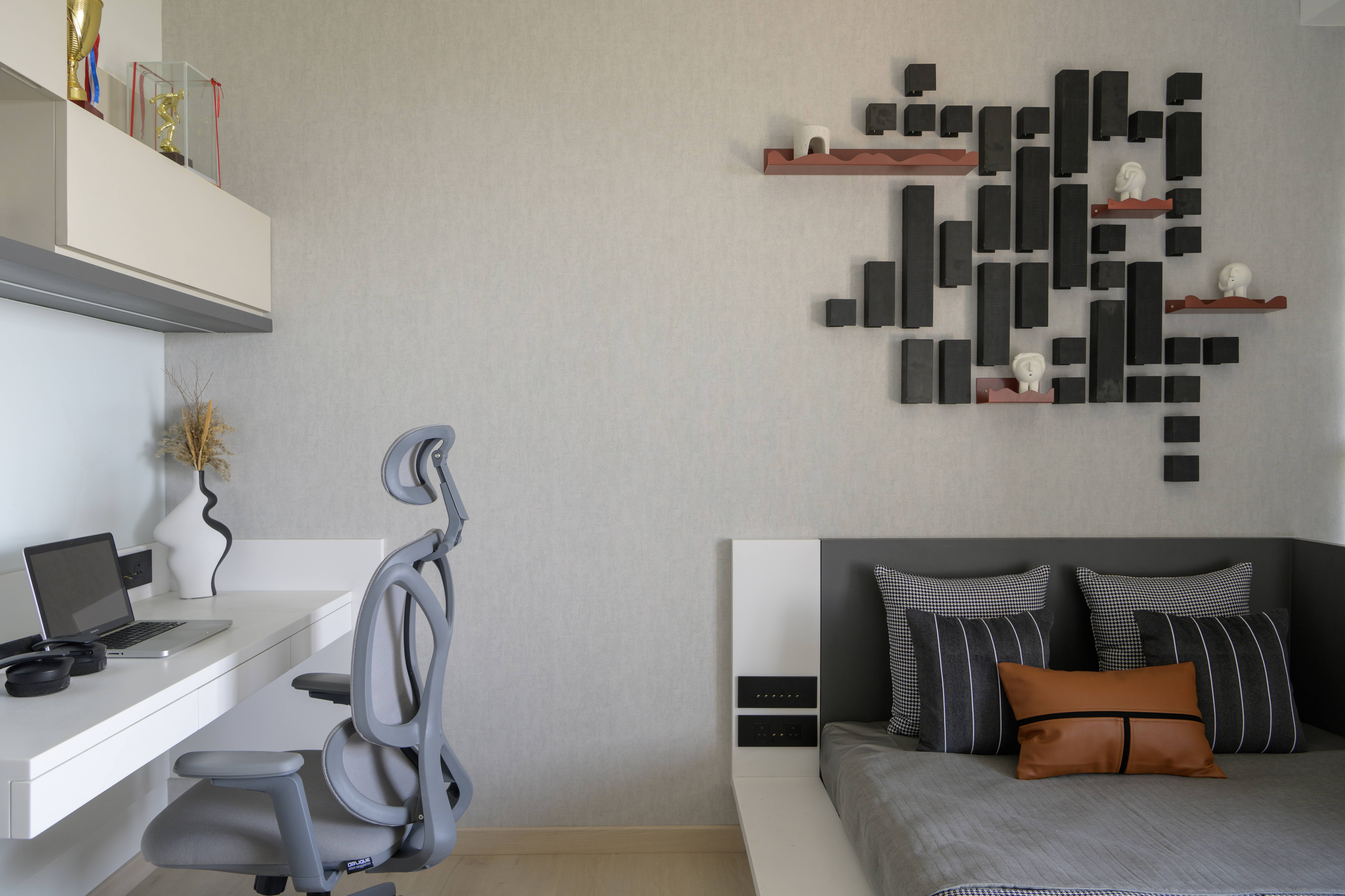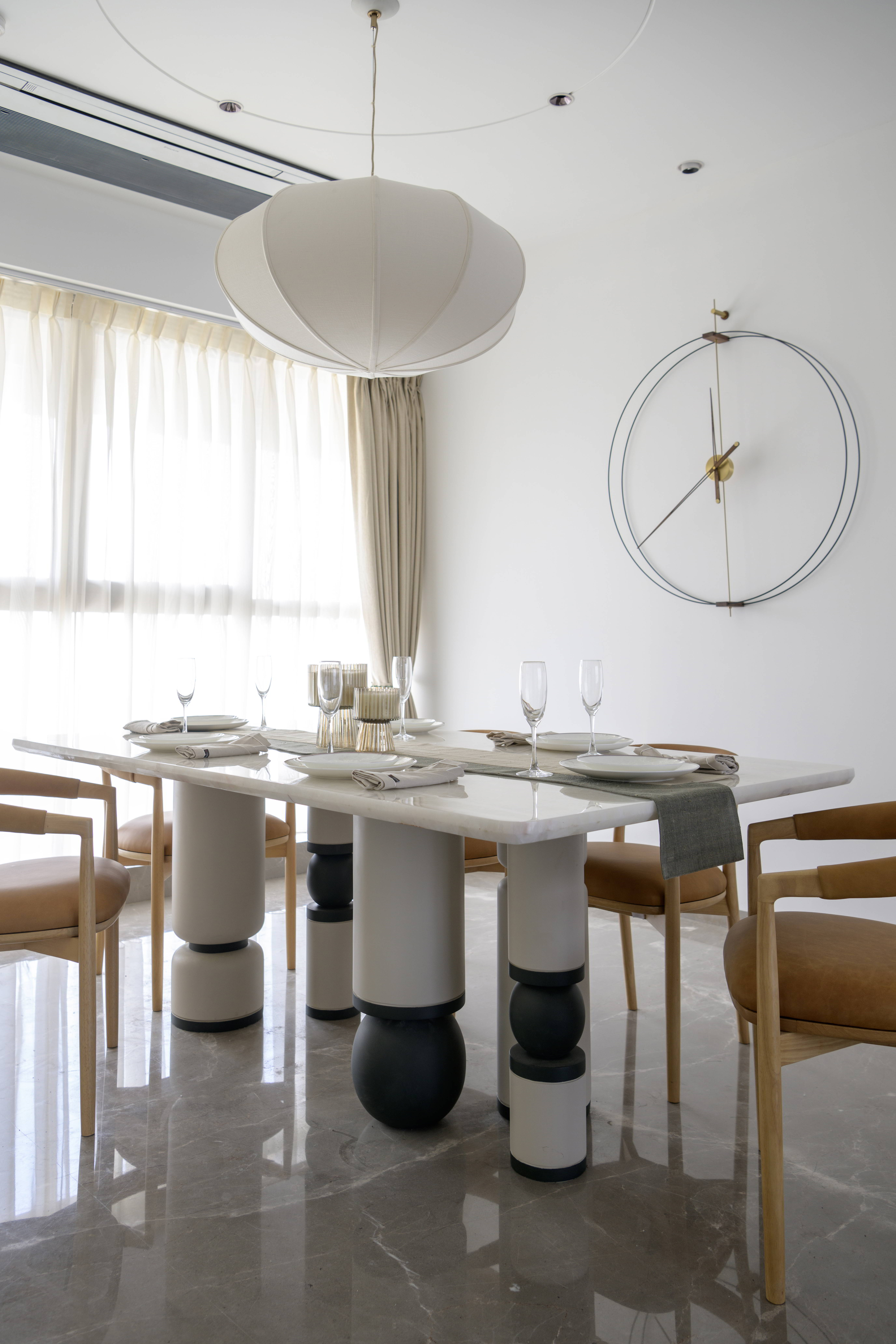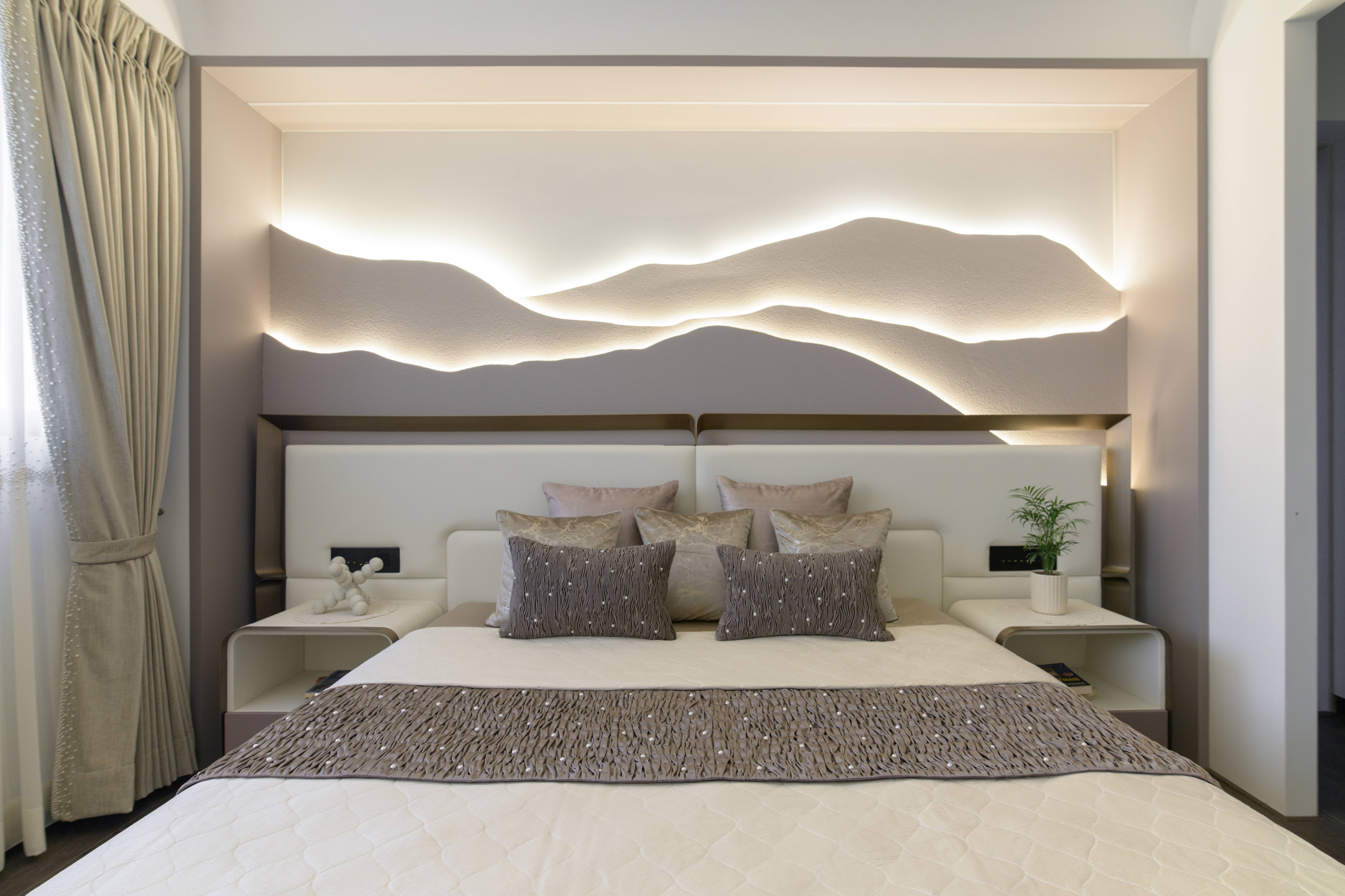 This contemporary residence is designed to feel calm, stylish, and welcoming. The overall concept blends clean lines, soft curves, and warm neutral tones to create a modern home with character. From the entrance lobby to the living room, every space is thoughtfully planned with a balance of comfort and elegance. Statement elements like sculptural partitions, custom wall details, and artistic décor add a unique identity to the interiors.