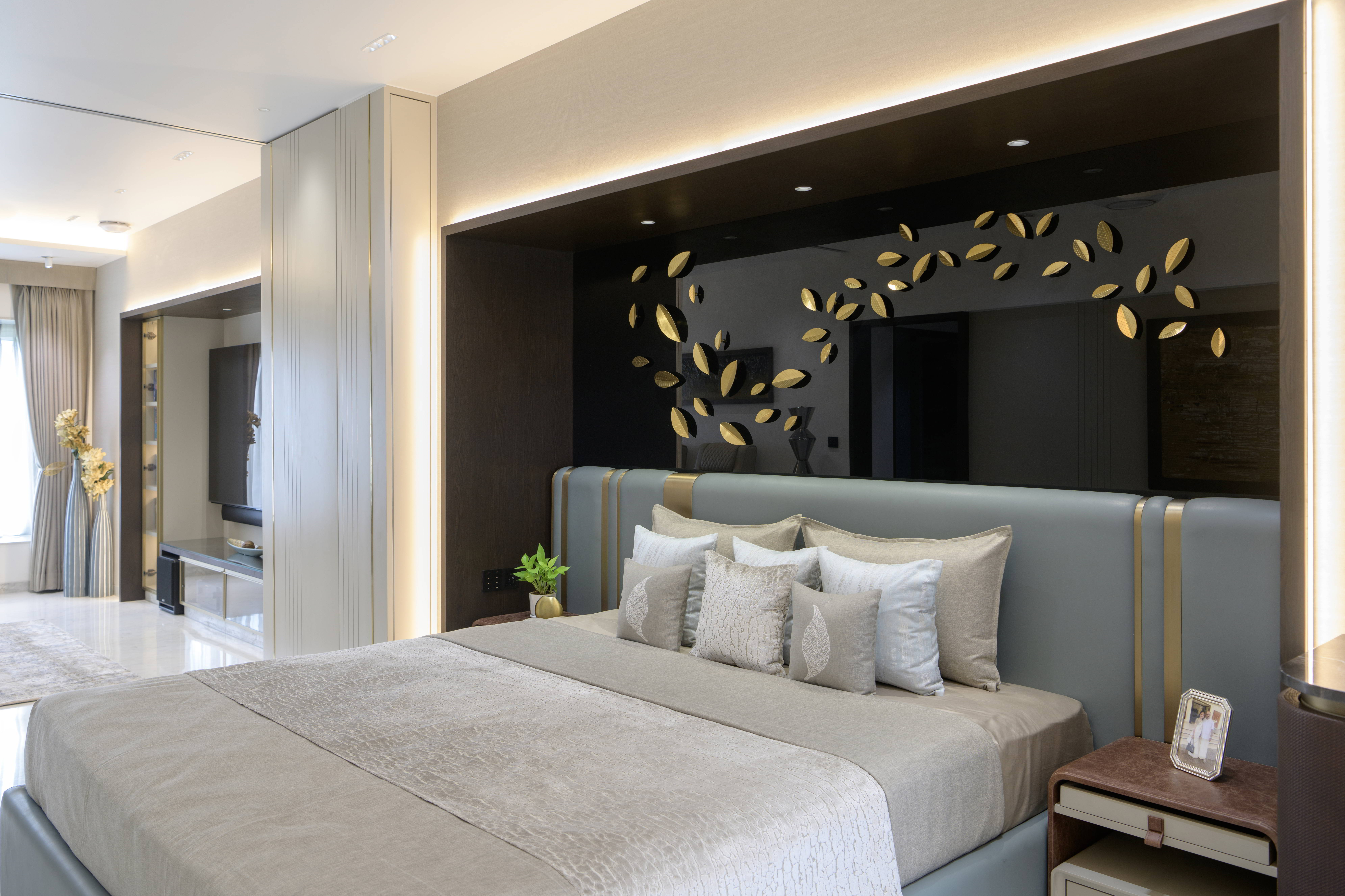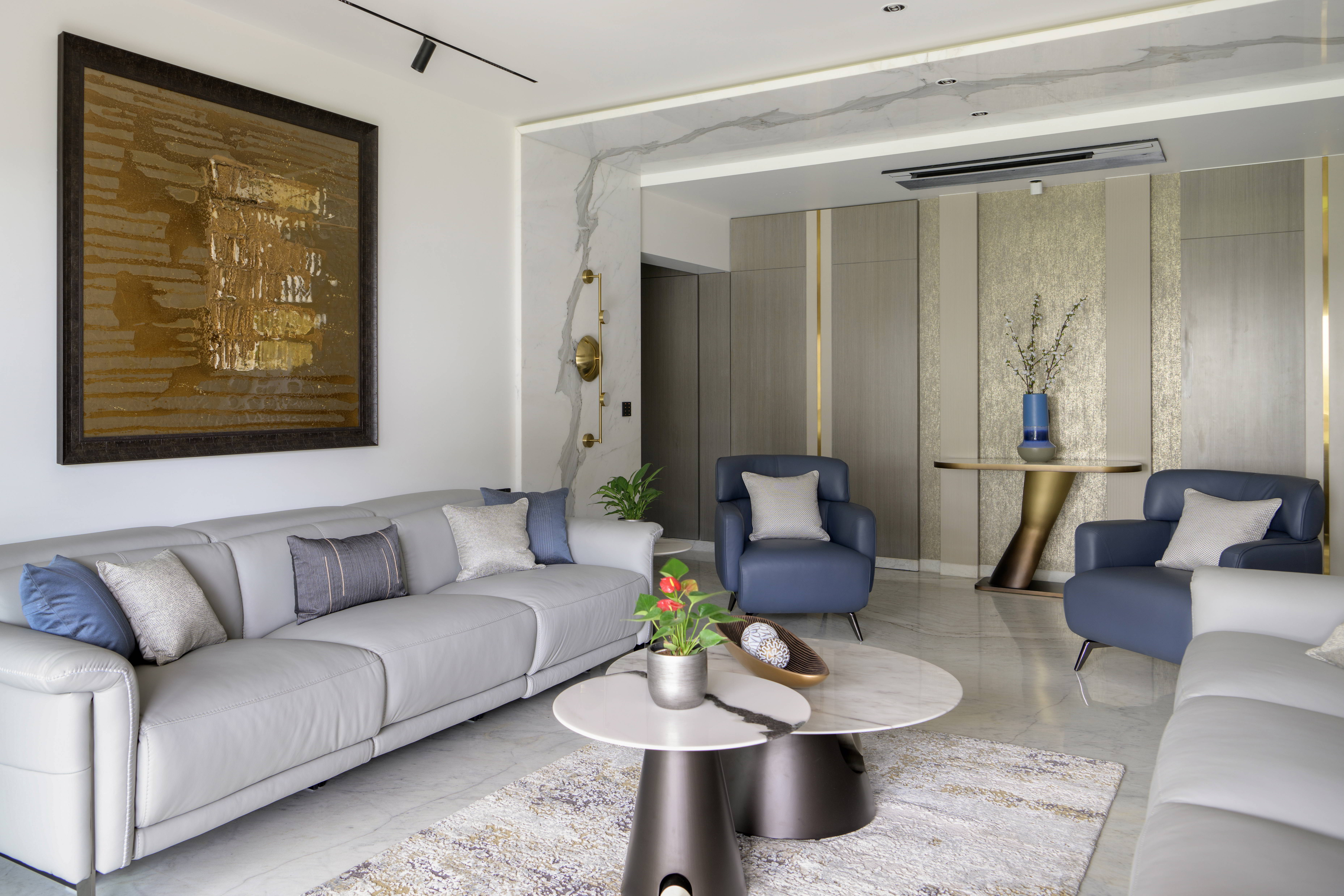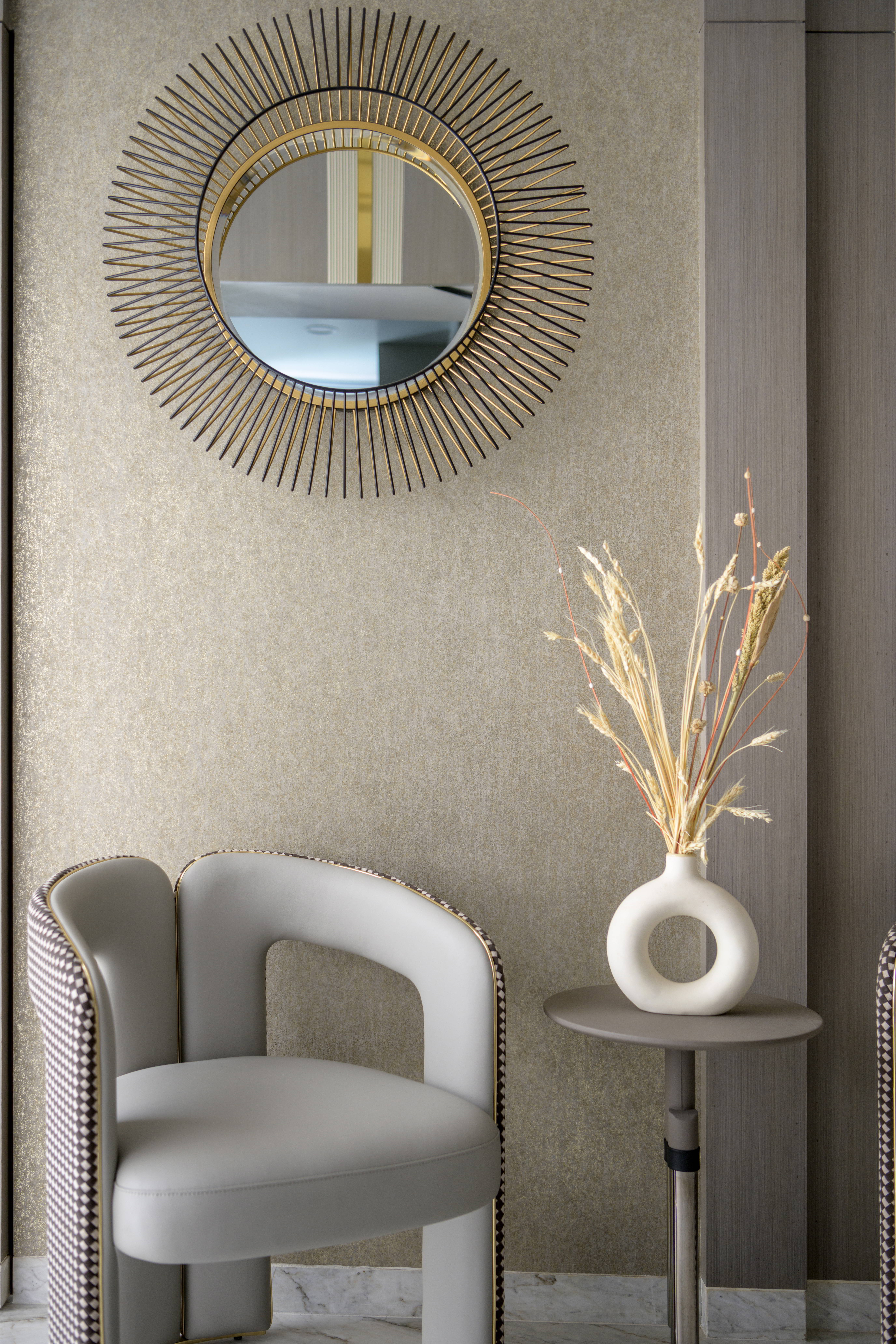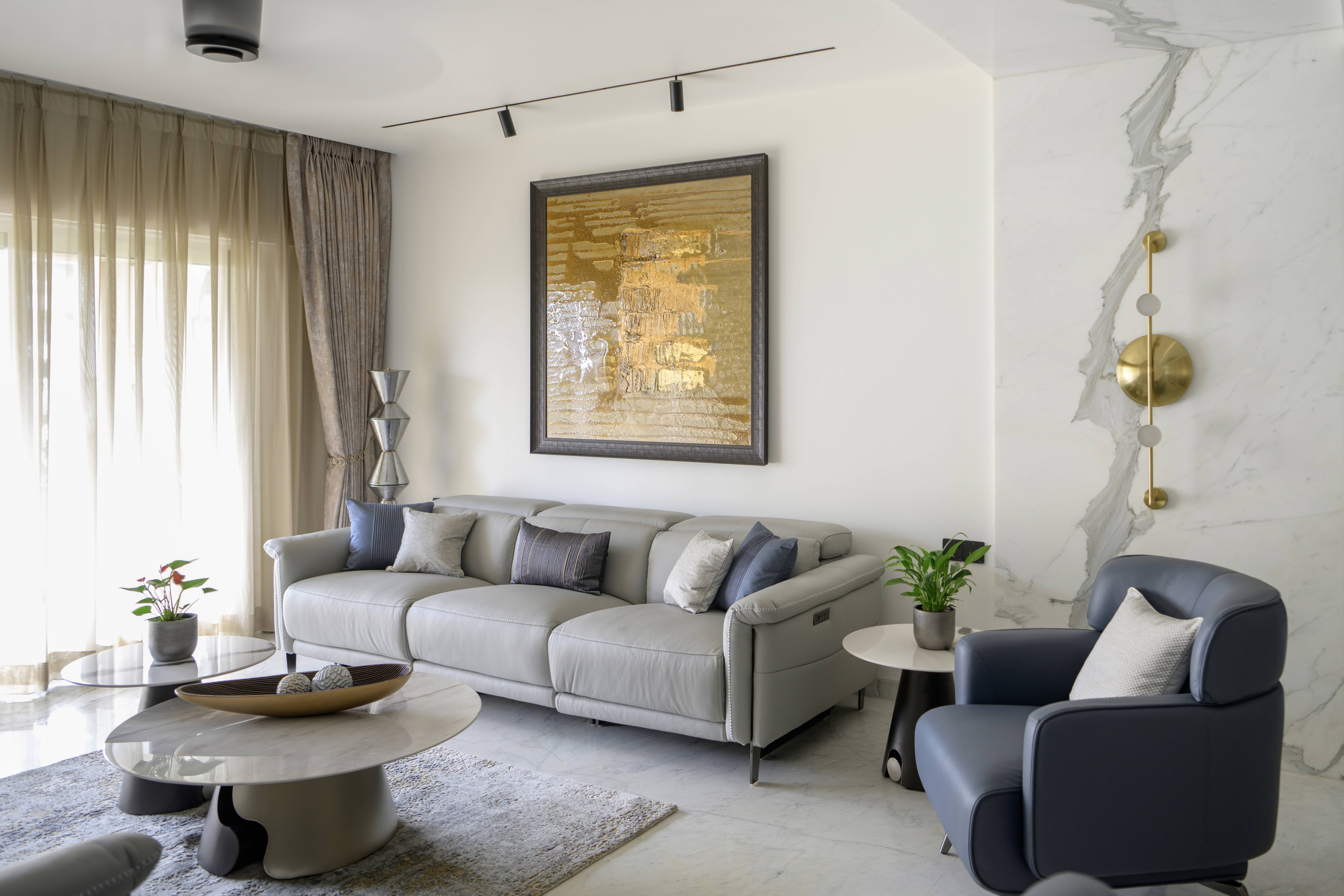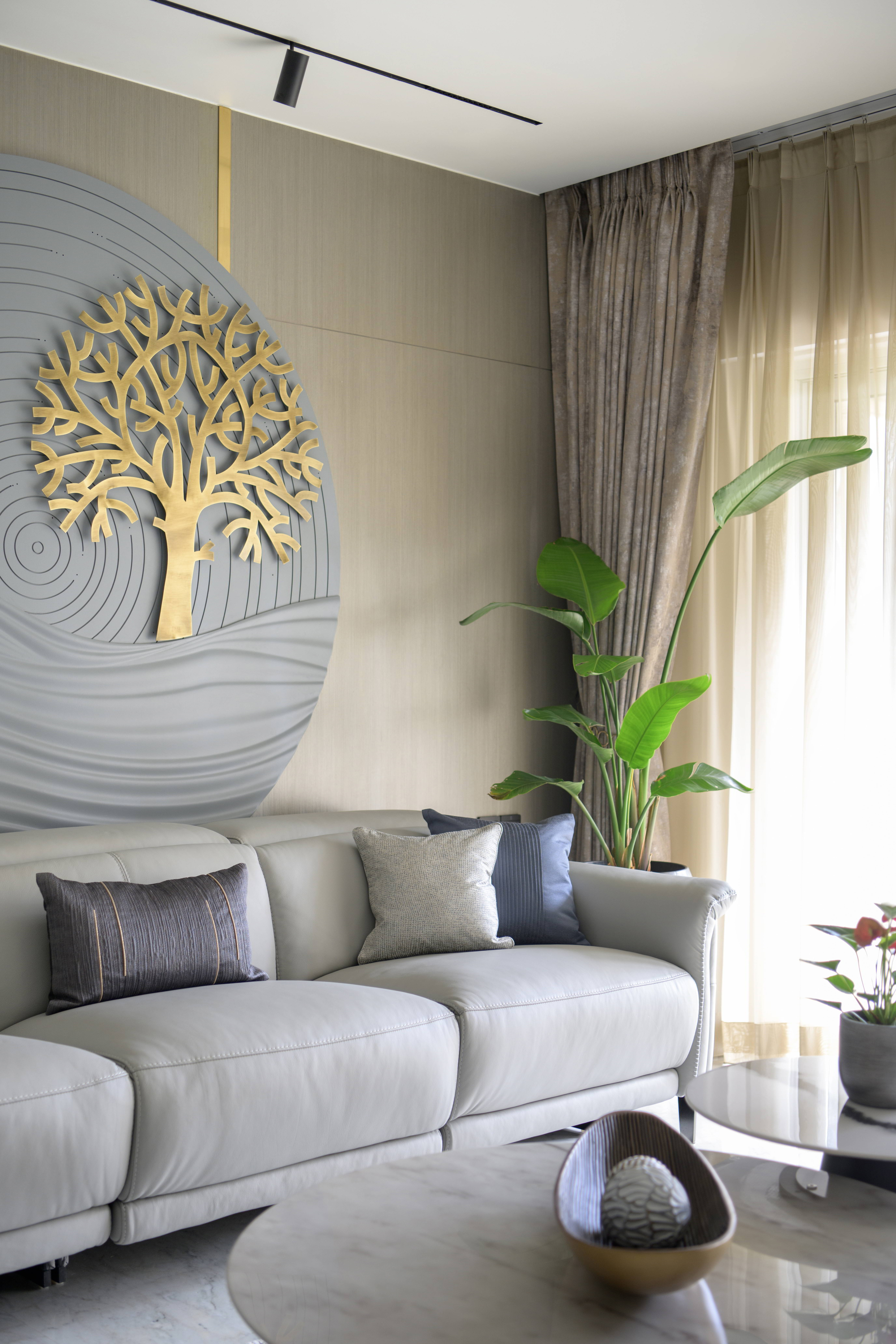 This residence is designed as a serene, contemporary retreat where elegance meets comfort in every detail. A soft, neutral palette forms the foundation of the space, allowing luxurious textures, metallic accents, and carefully curated decor pieces to shine effortlessly. The living area is anchored by plush seating in muted tones, complemented by striking gold artwork and sculptural wall elements that add depth and sophistication.