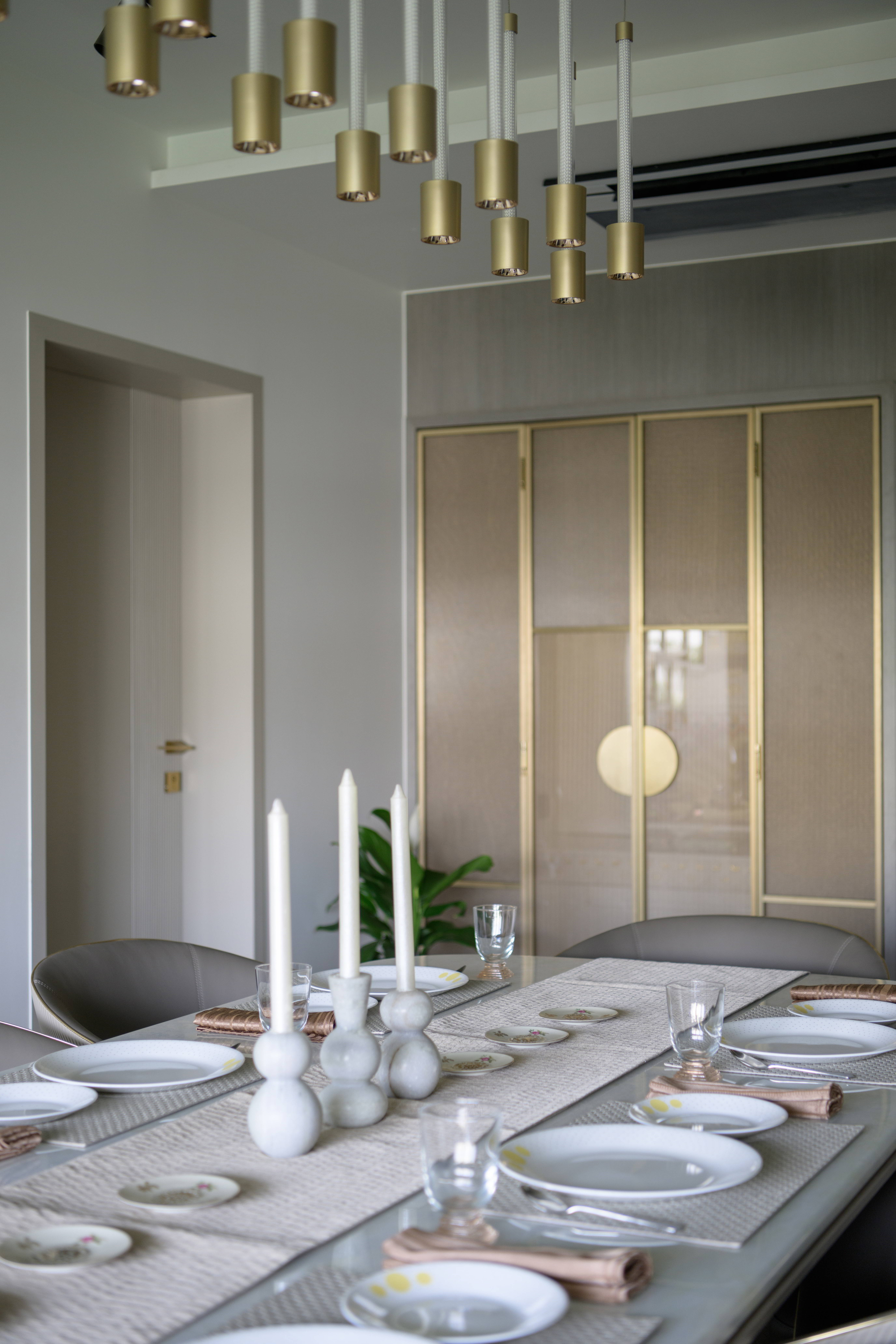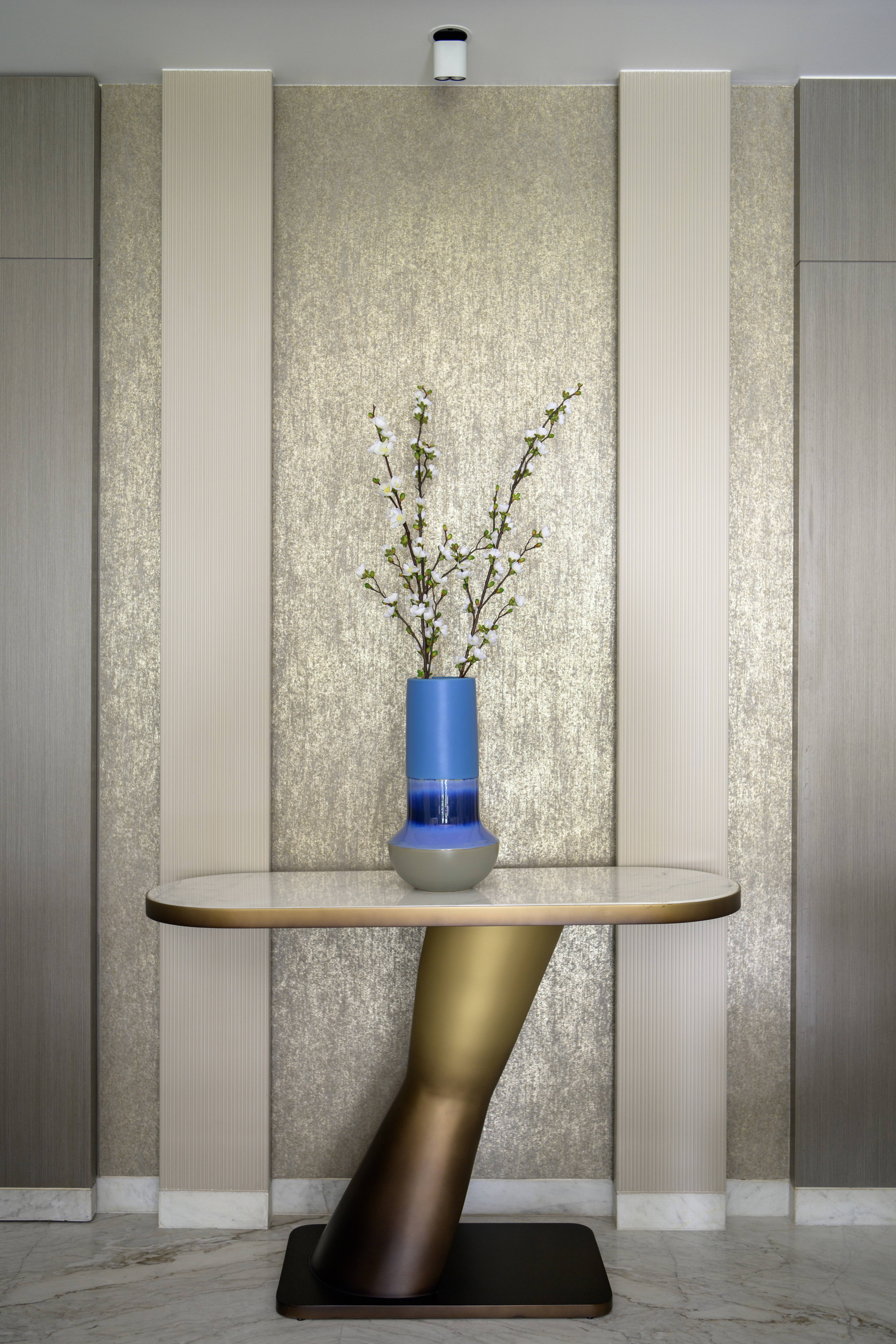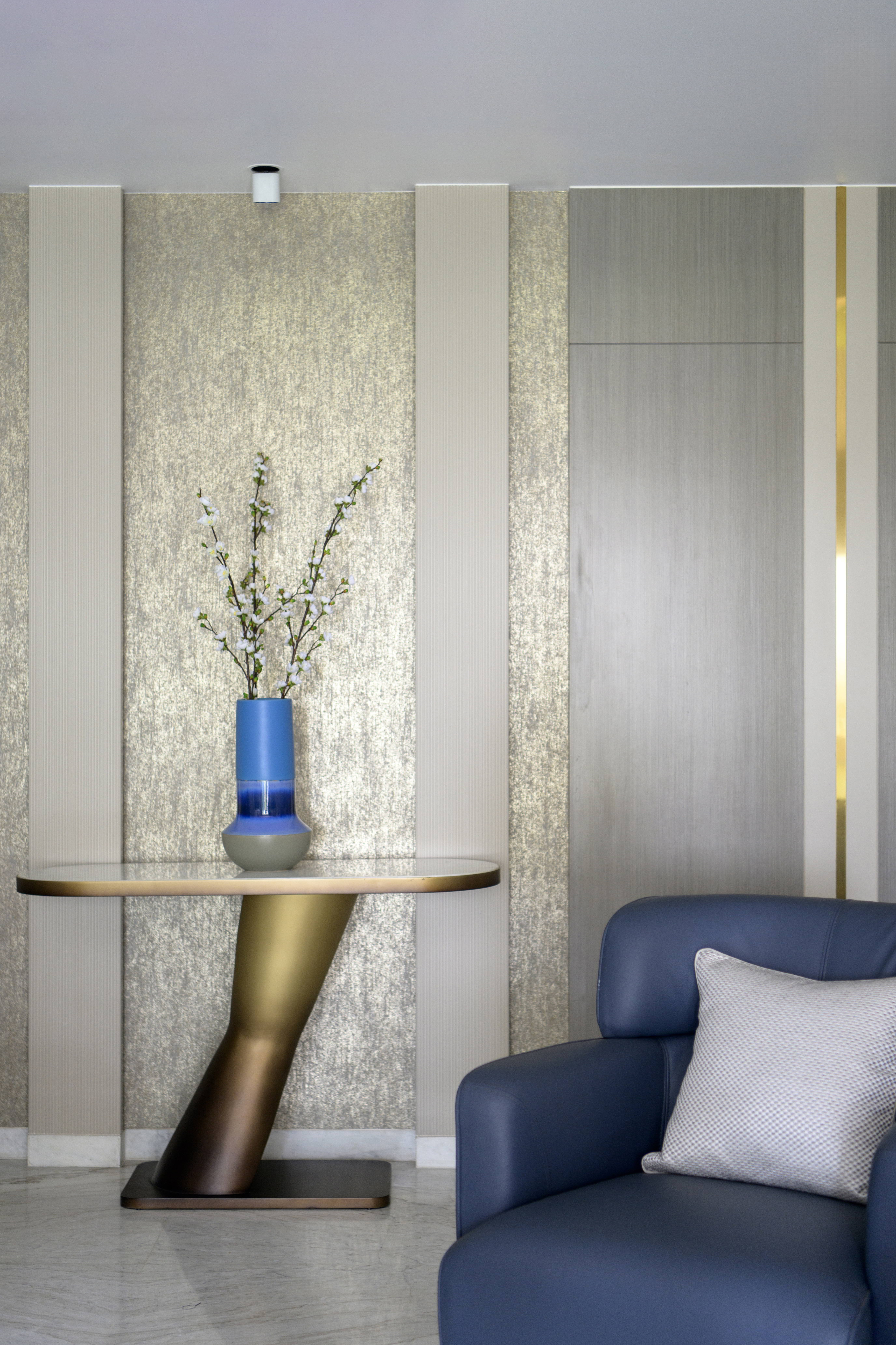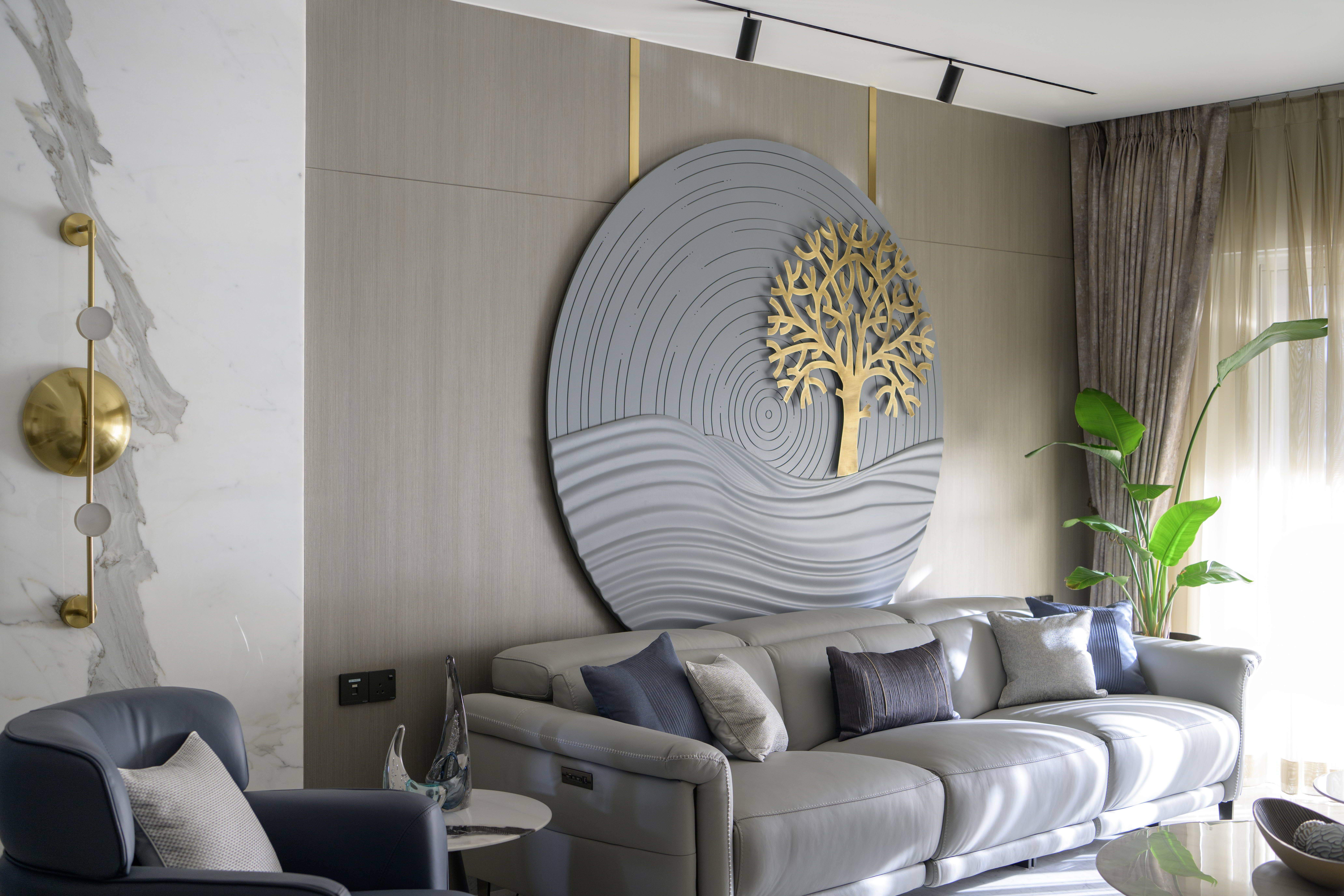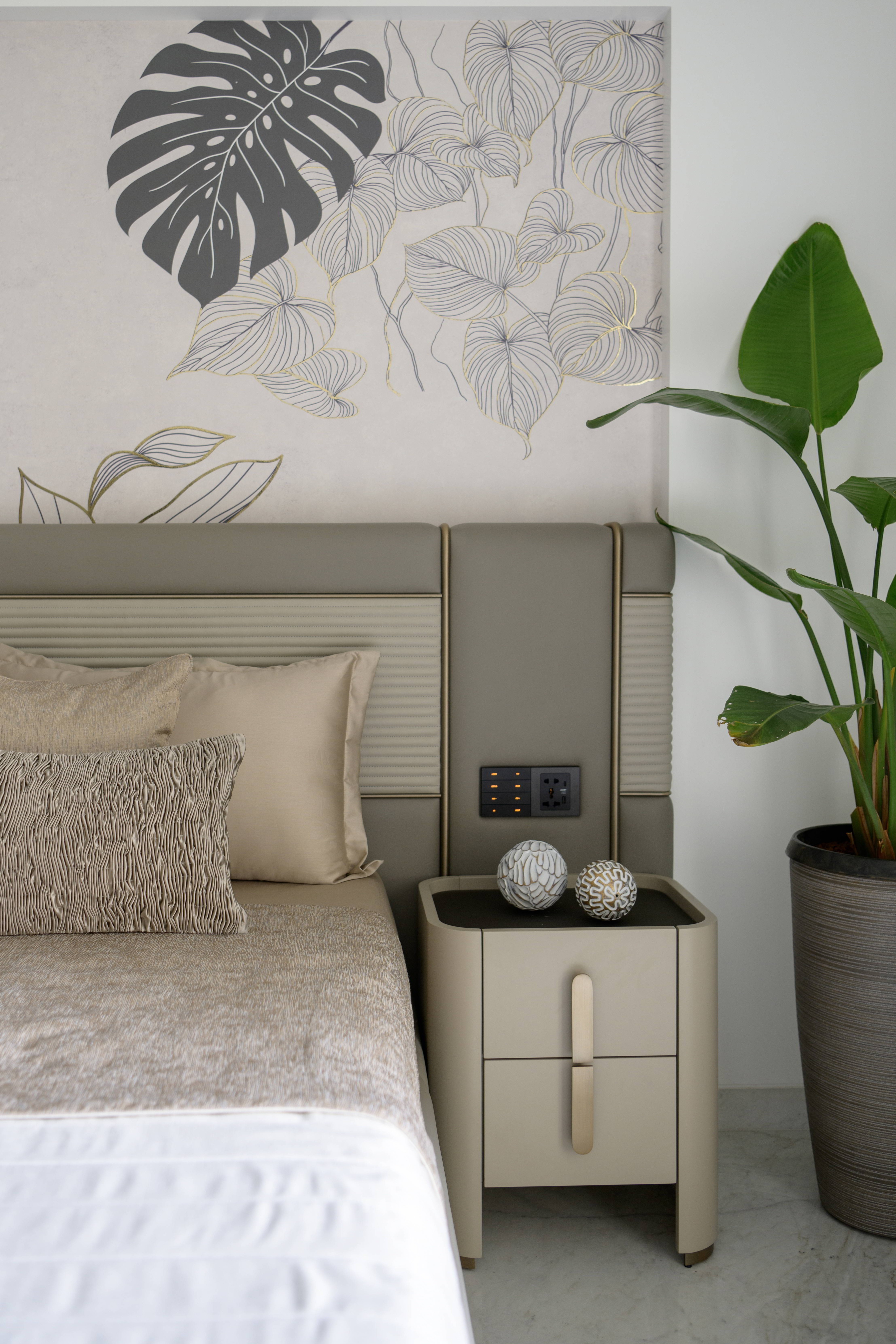 This residence is designed as a serene, contemporary retreat where elegance meets comfort in every detail. A soft, neutral palette forms the foundation of the space, allowing luxurious textures, metallic accents, and carefully curated decor pieces to shine effortlessly. The living area is anchored by plush seating in muted tones, complemented by striking gold artwork and sculptural wall elements that add depth and sophistication.