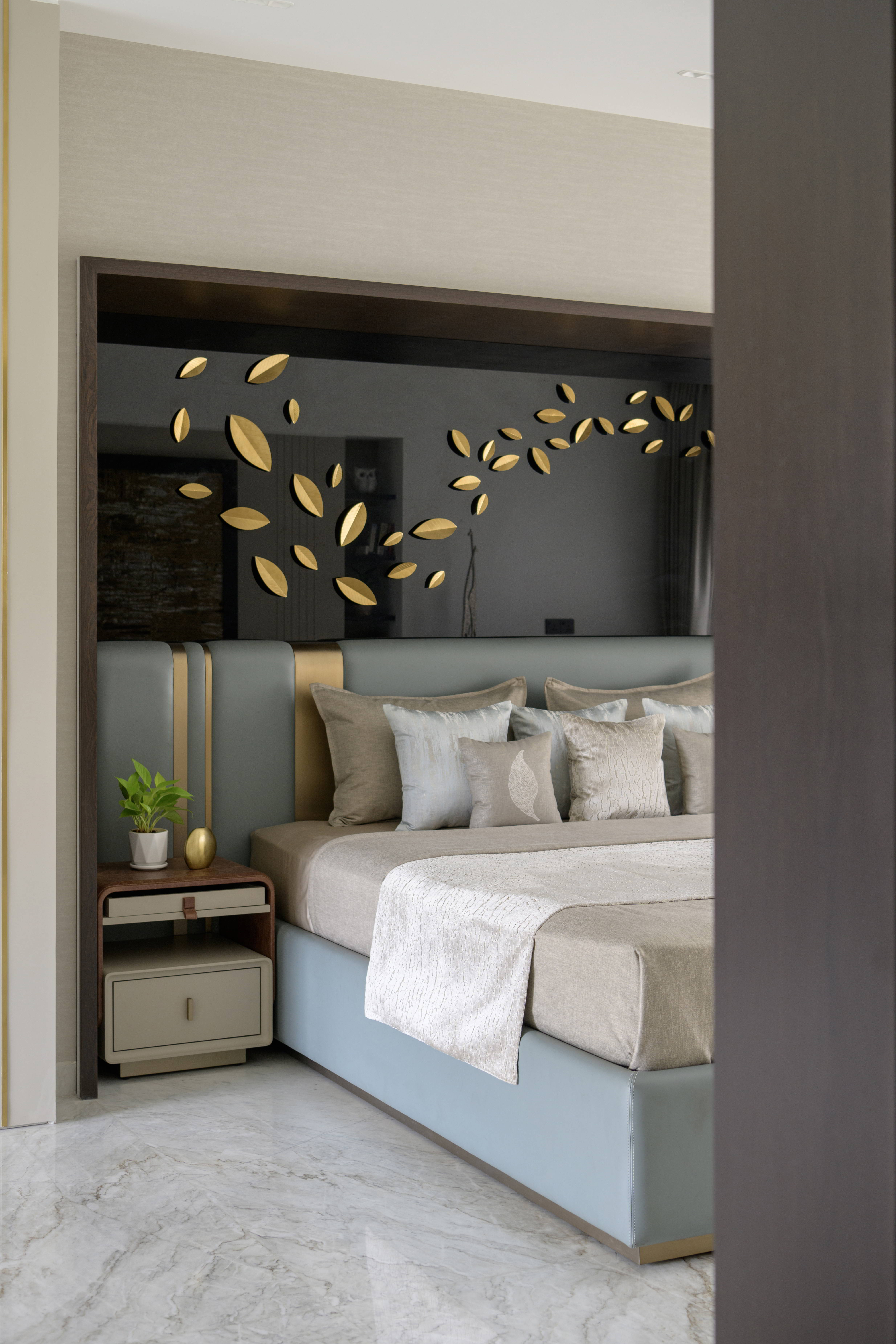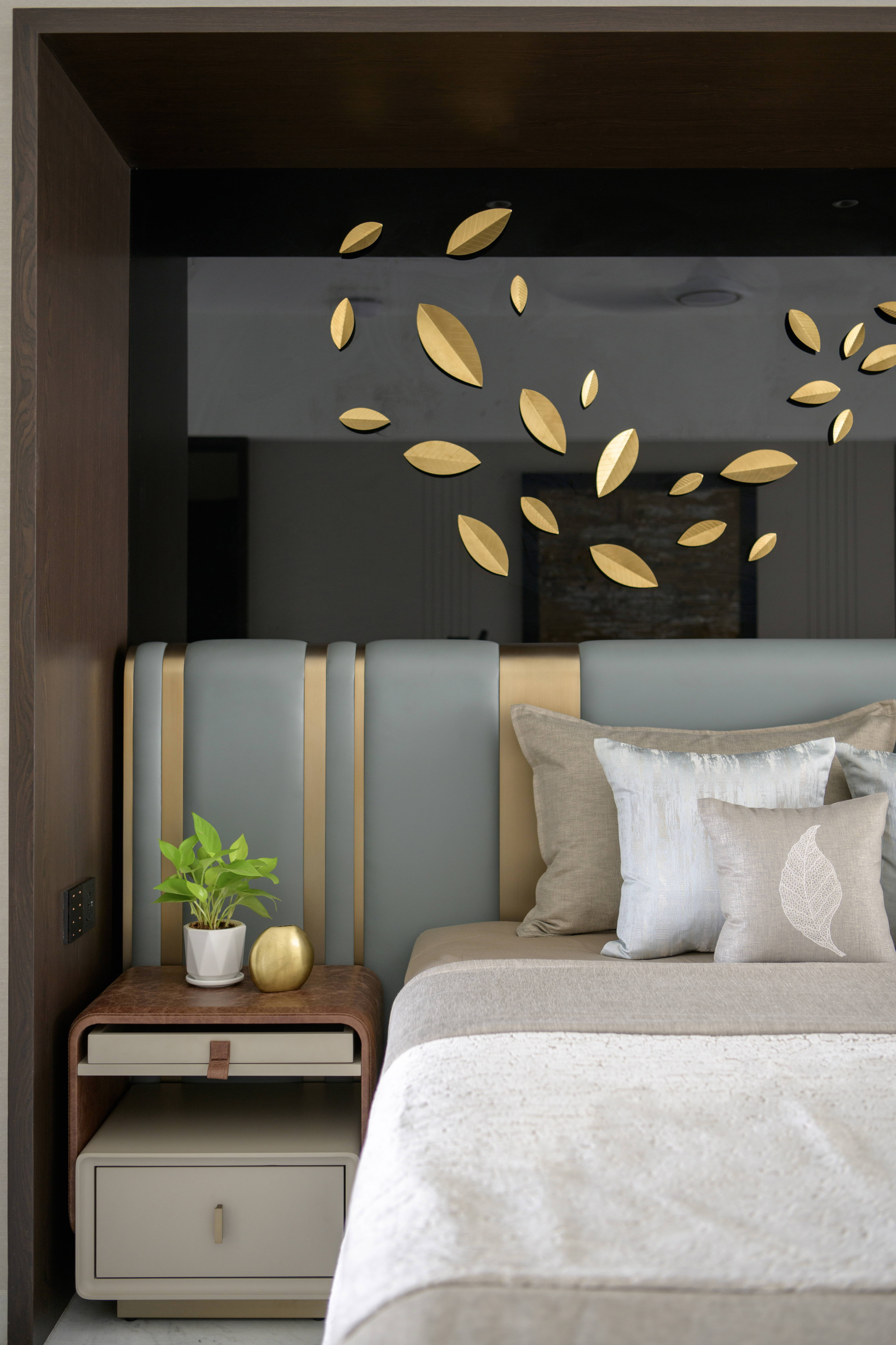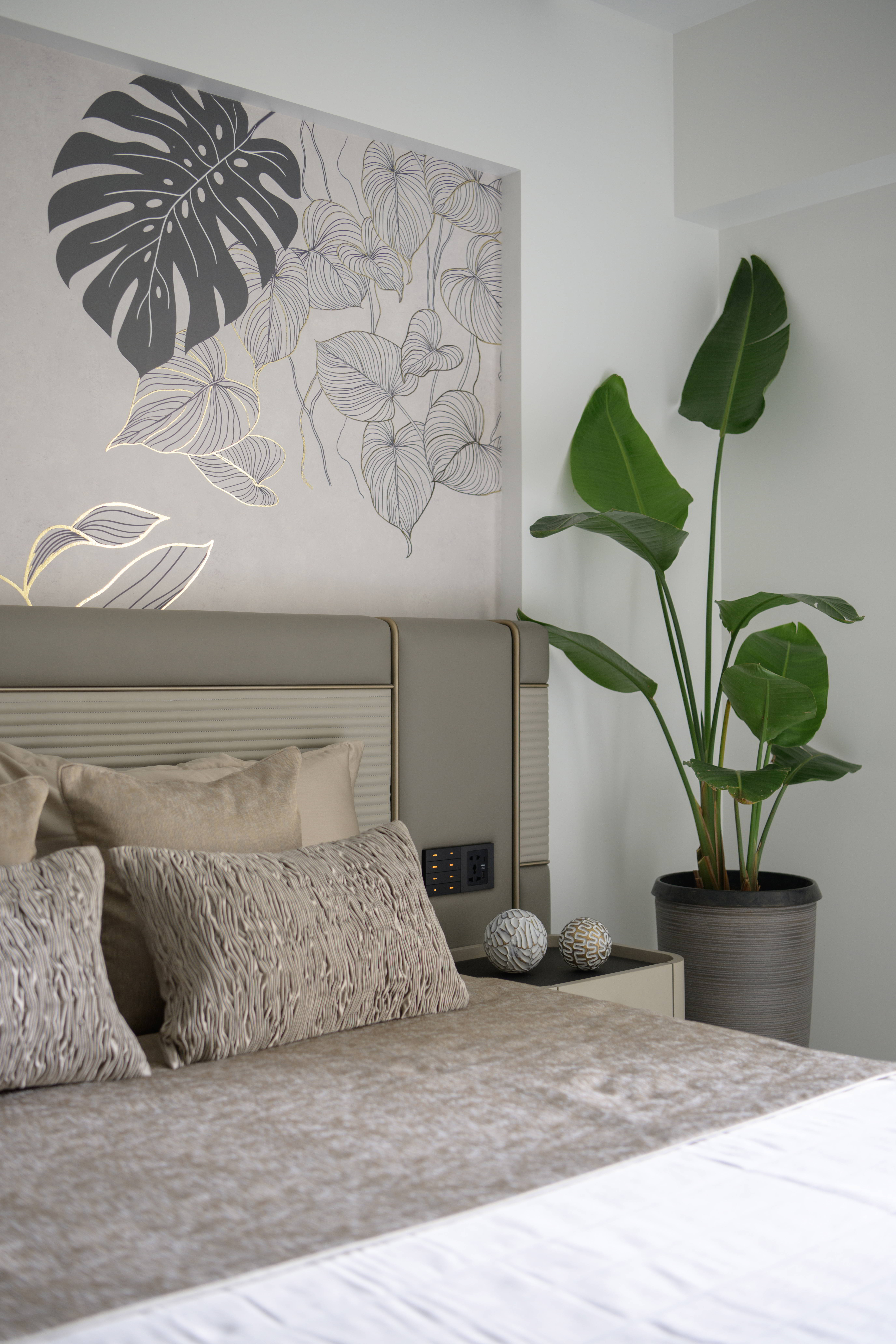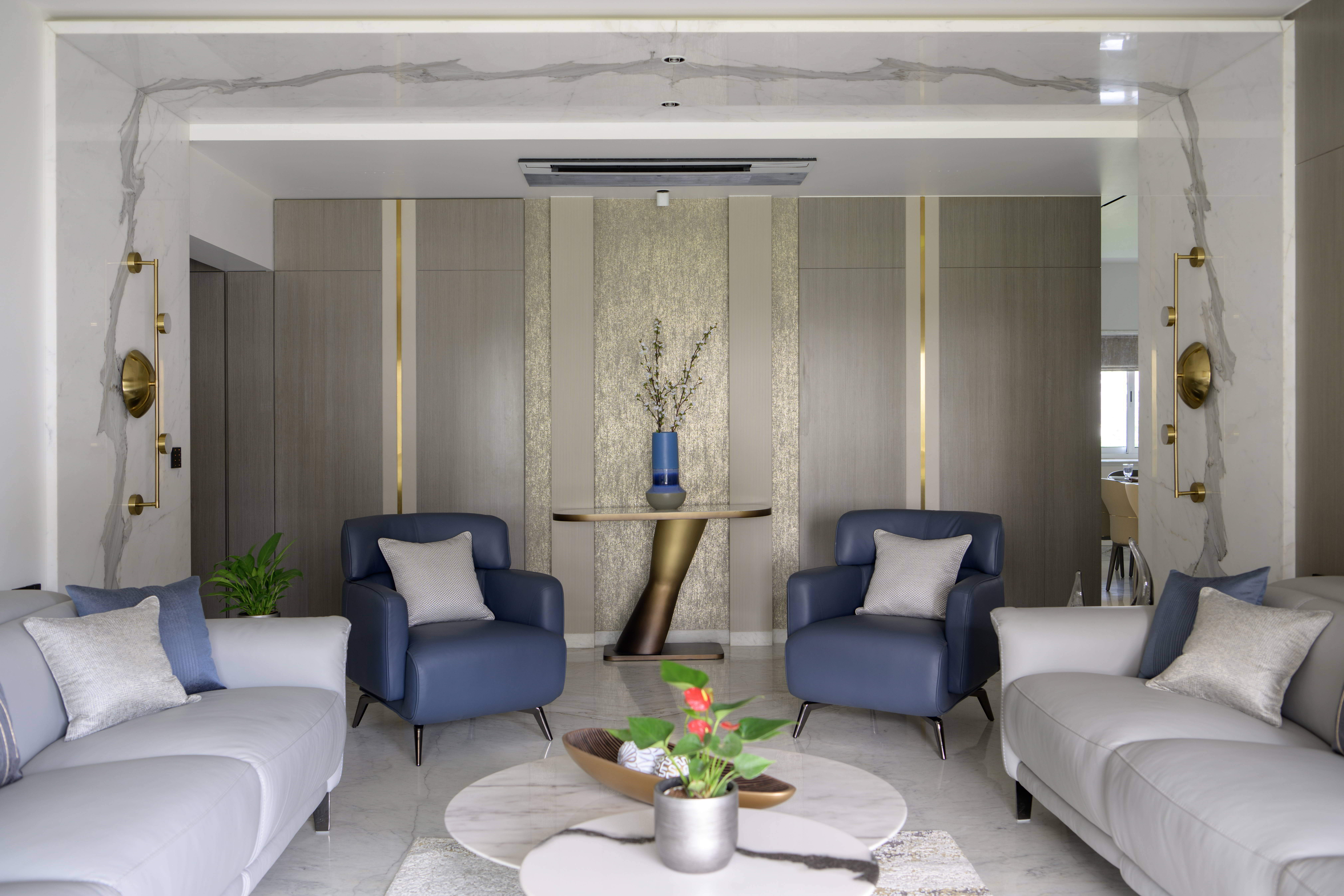This residence is designed as a serene, contemporary retreat where elegance meets comfort in every detail. A soft, neutral palette forms the foundation of the space, allowing luxurious textures, metallic accents, and carefully curated decor pieces to shine effortlessly. The living area is anchored by plush seating in muted tones, complemented by striking gold artwork and sculptural wall elements that add depth and sophistication.