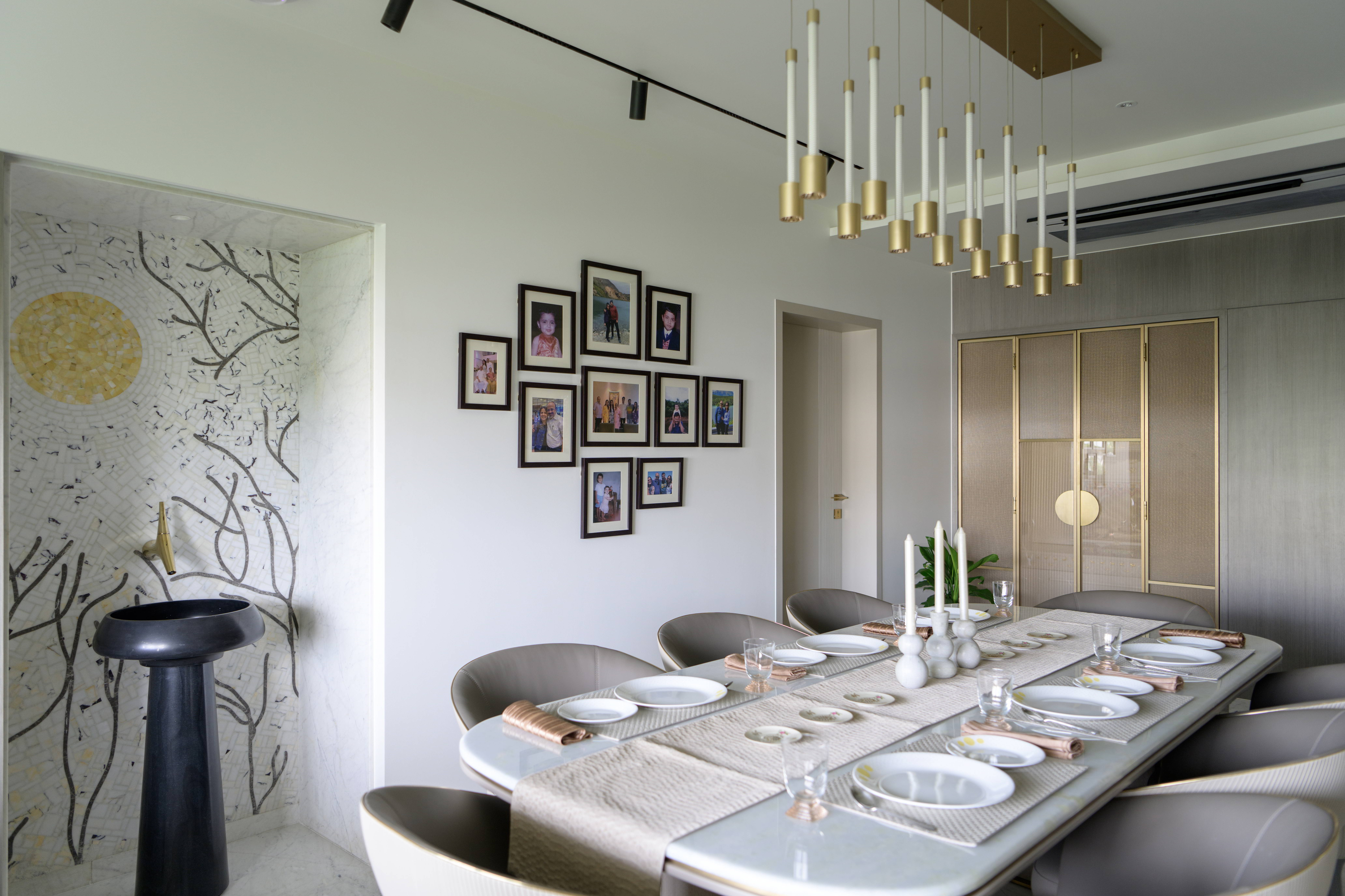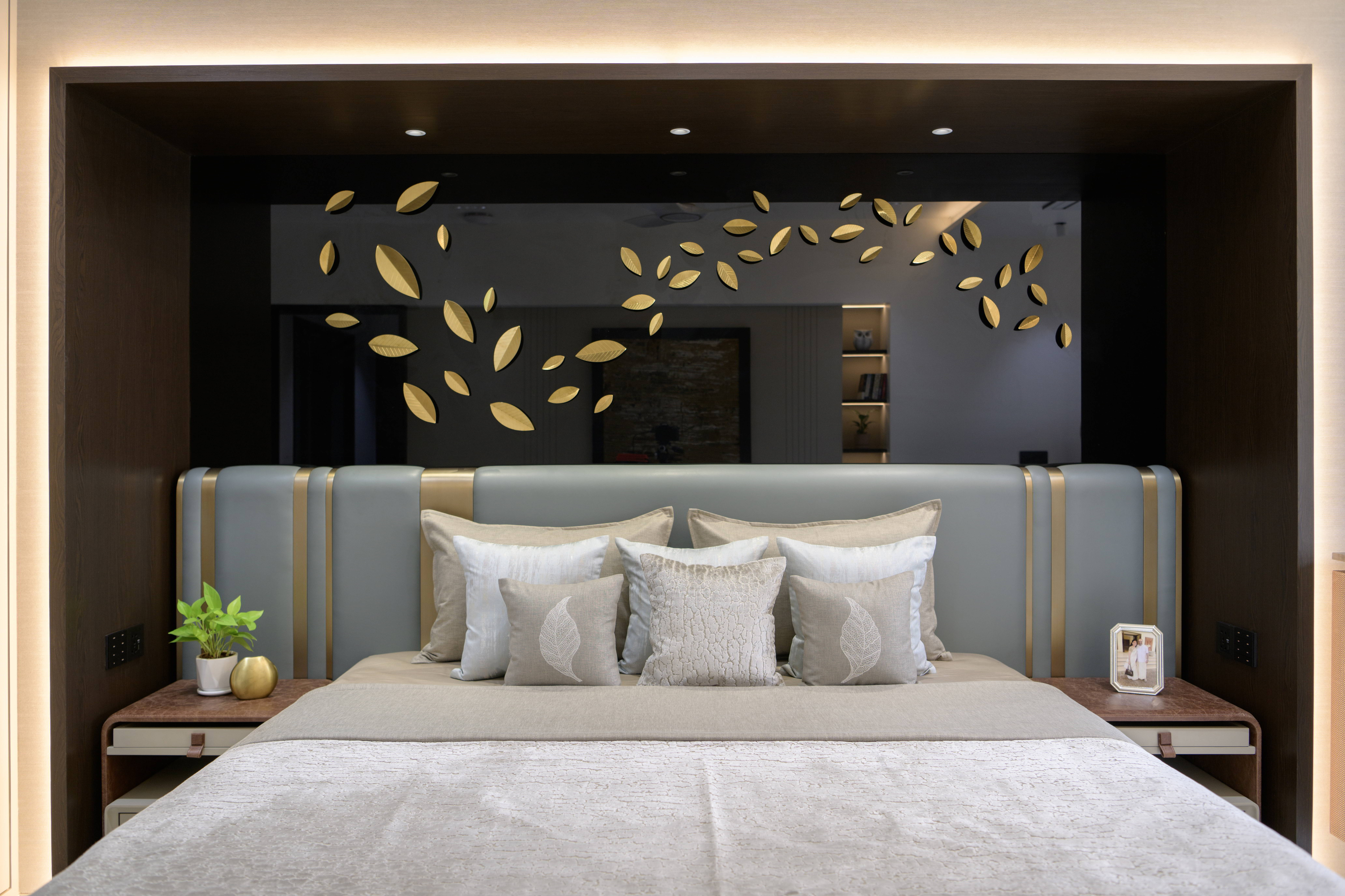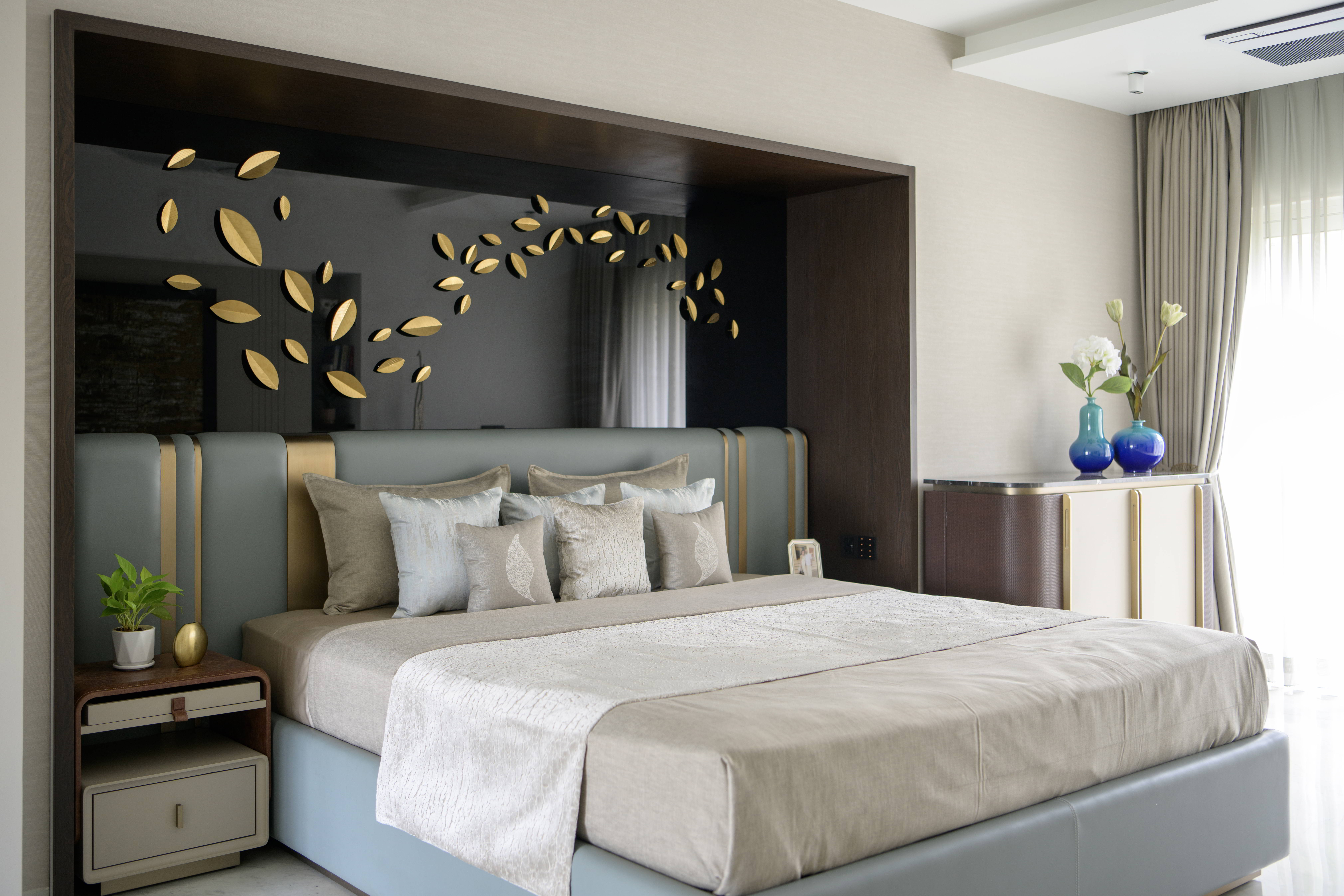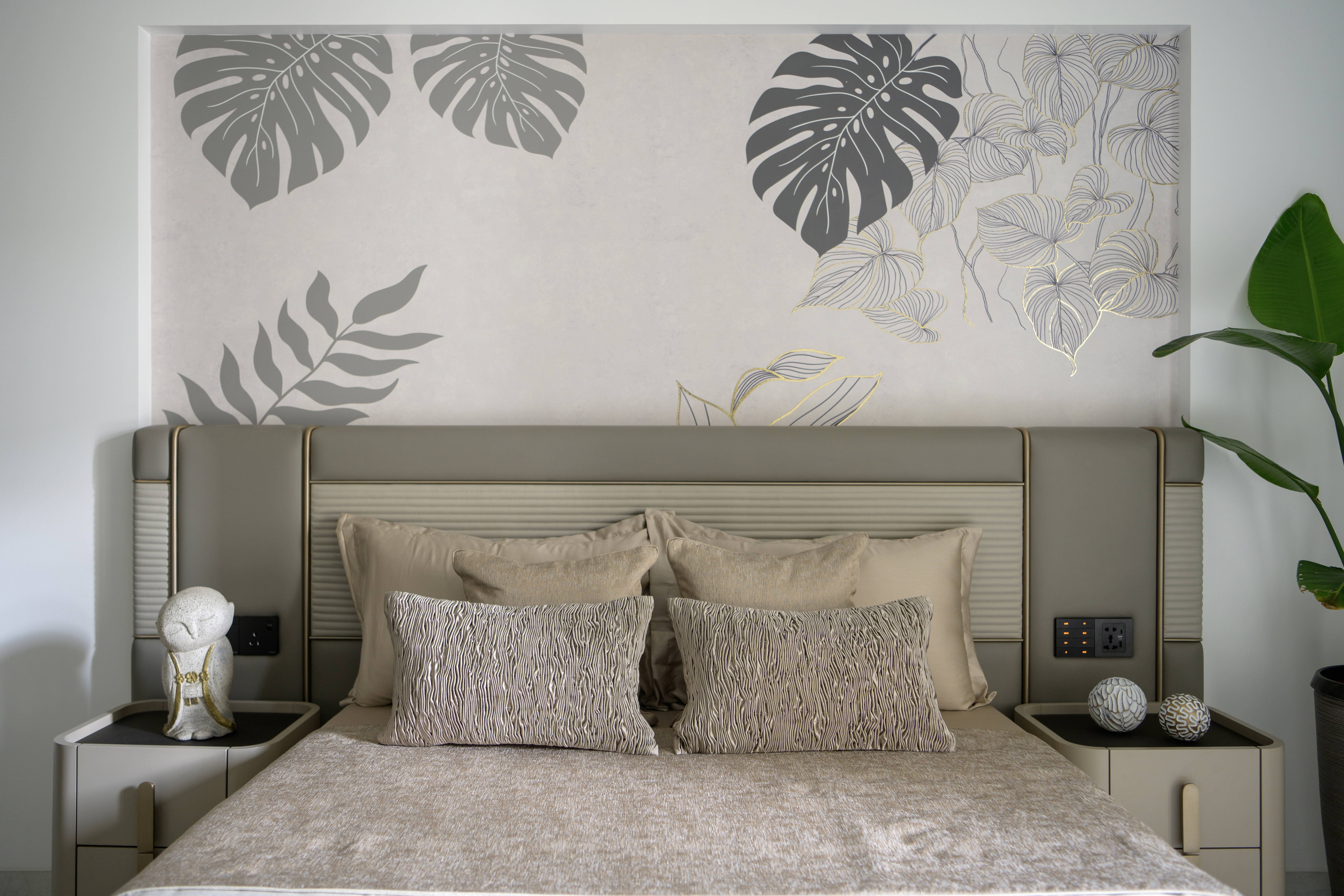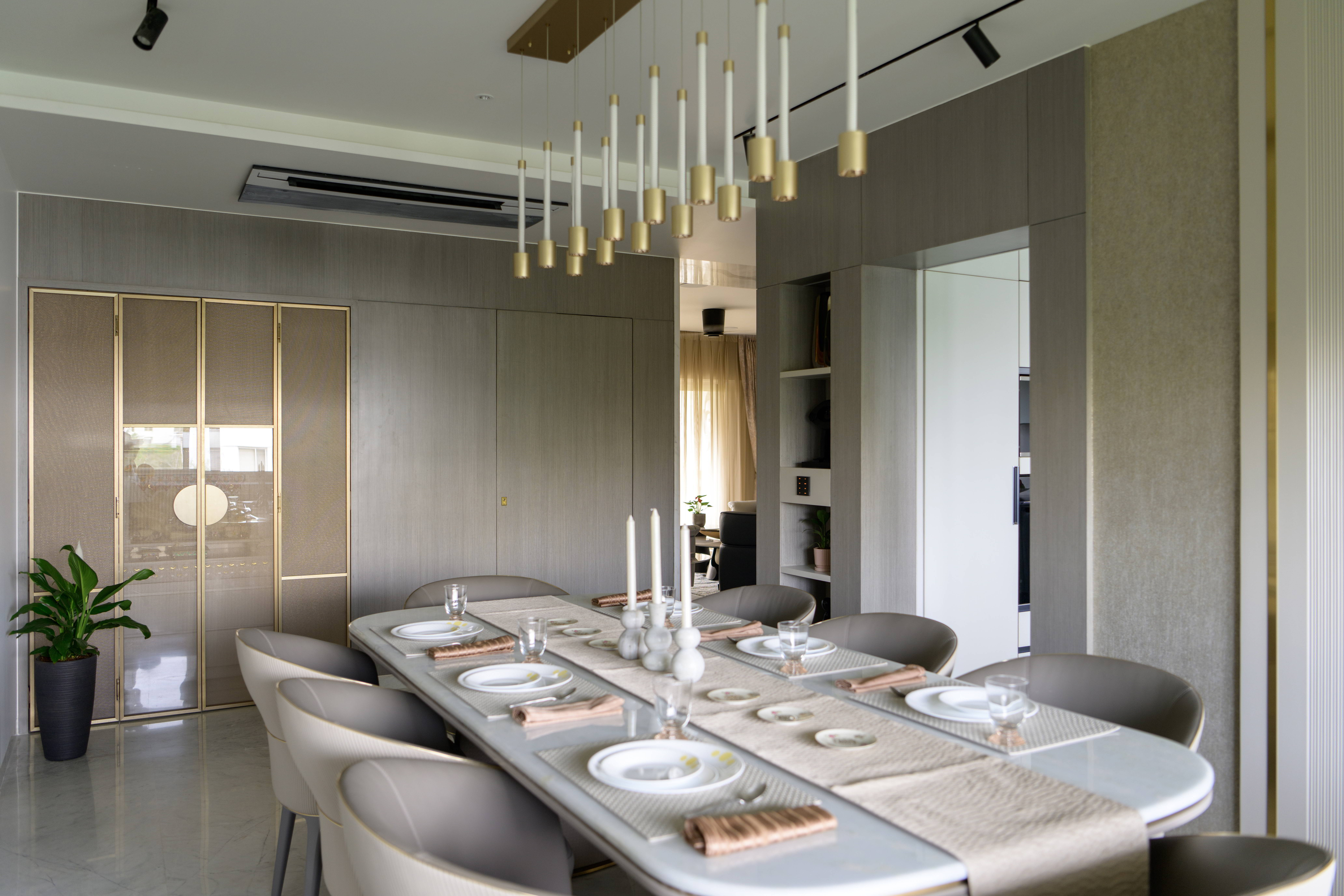 This residence is designed as a serene, contemporary retreat where elegance meets comfort in every detail. A soft, neutral palette forms the foundation of the space, allowing luxurious textures, metallic accents, and carefully curated decor pieces to shine effortlessly. The living area is anchored by plush seating in muted tones, complemented by striking gold artwork and sculptural wall elements that add depth and sophistication.