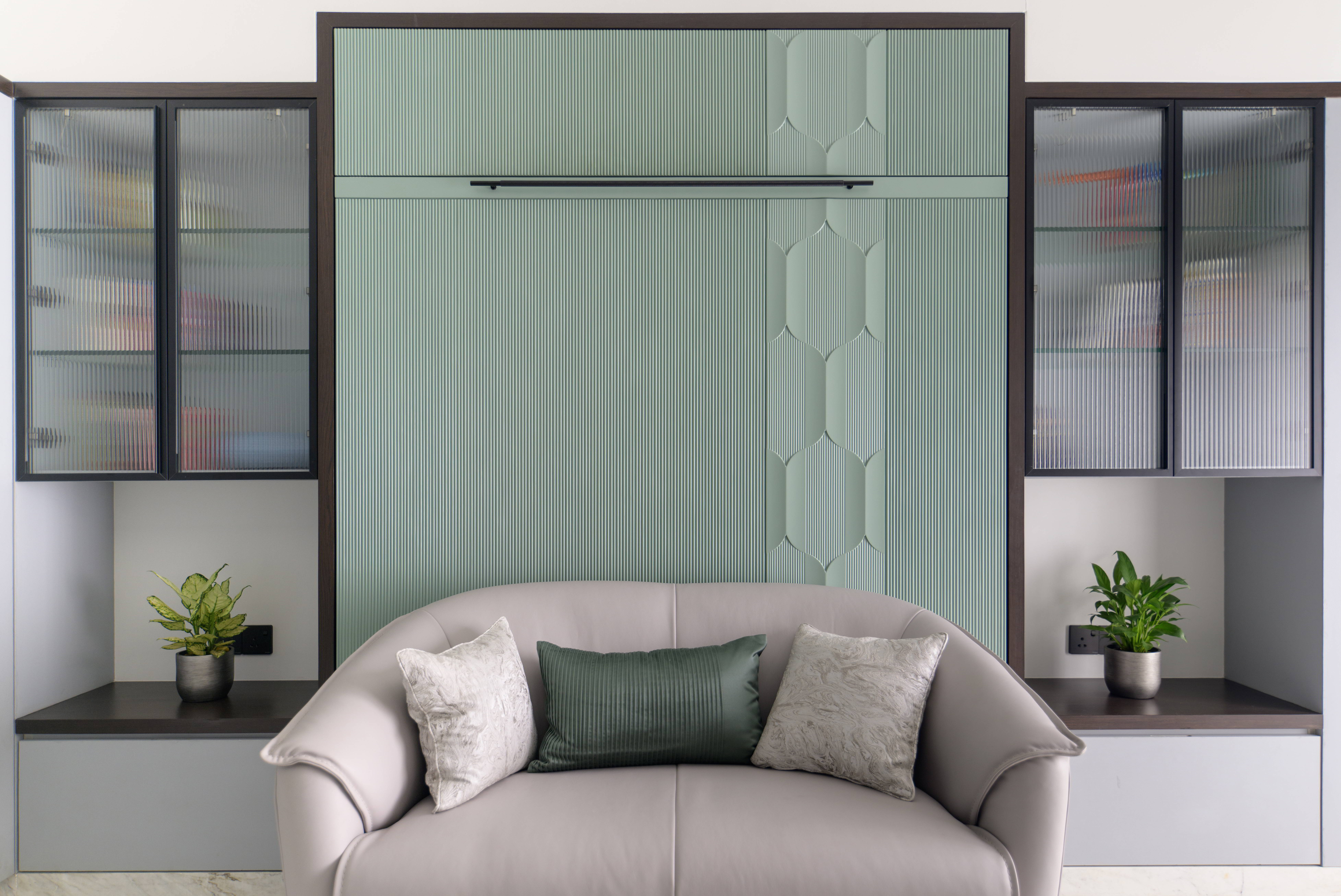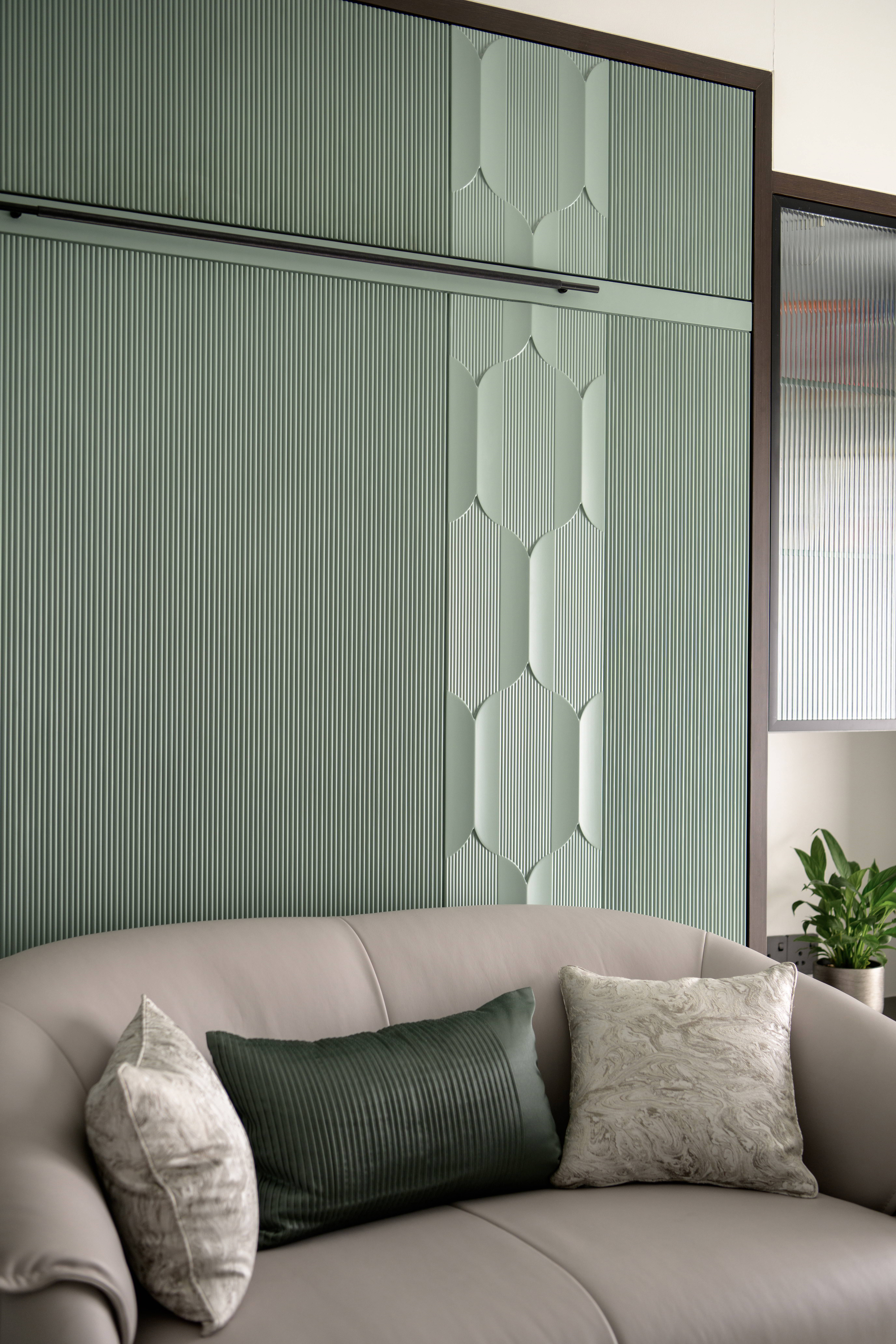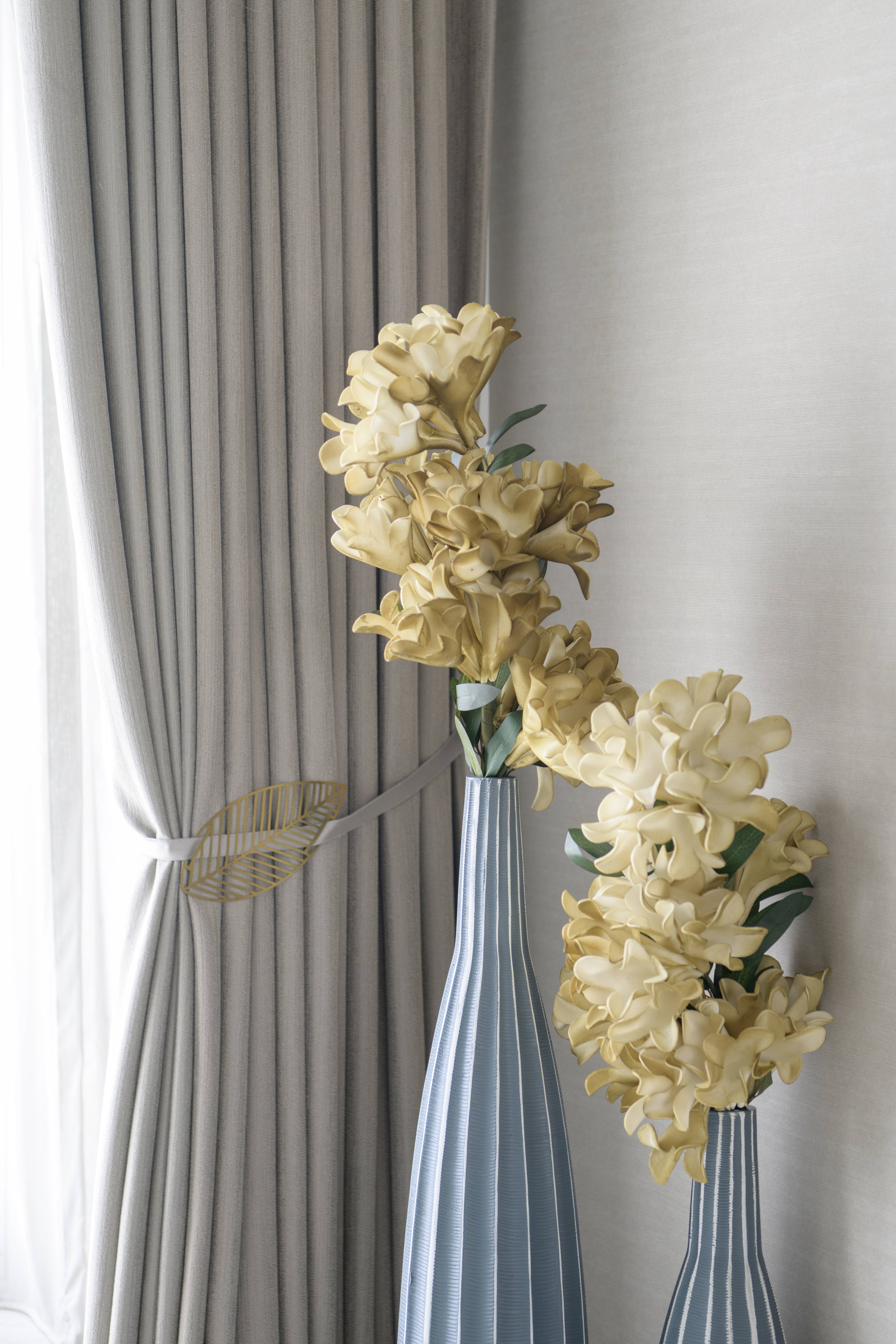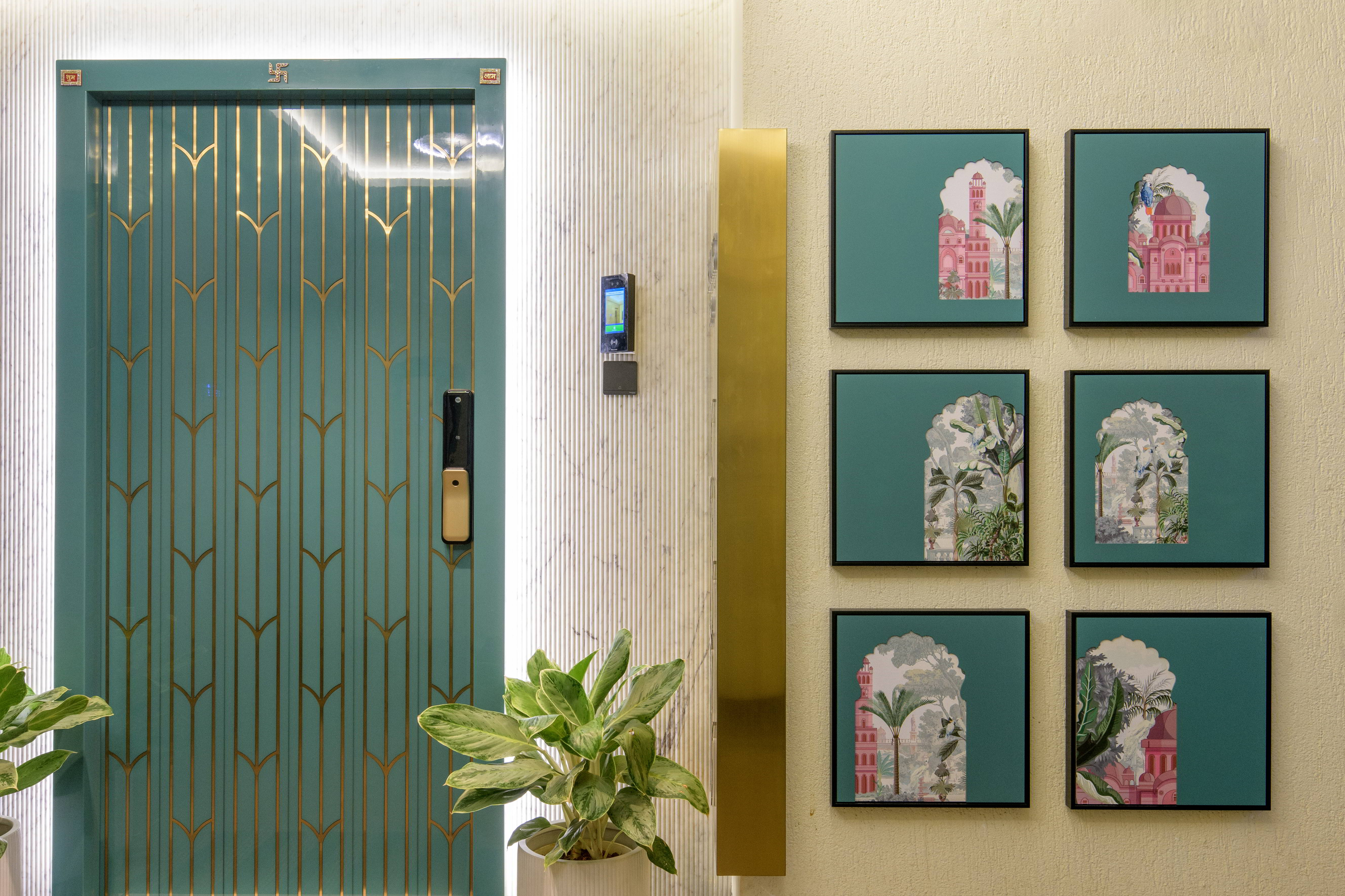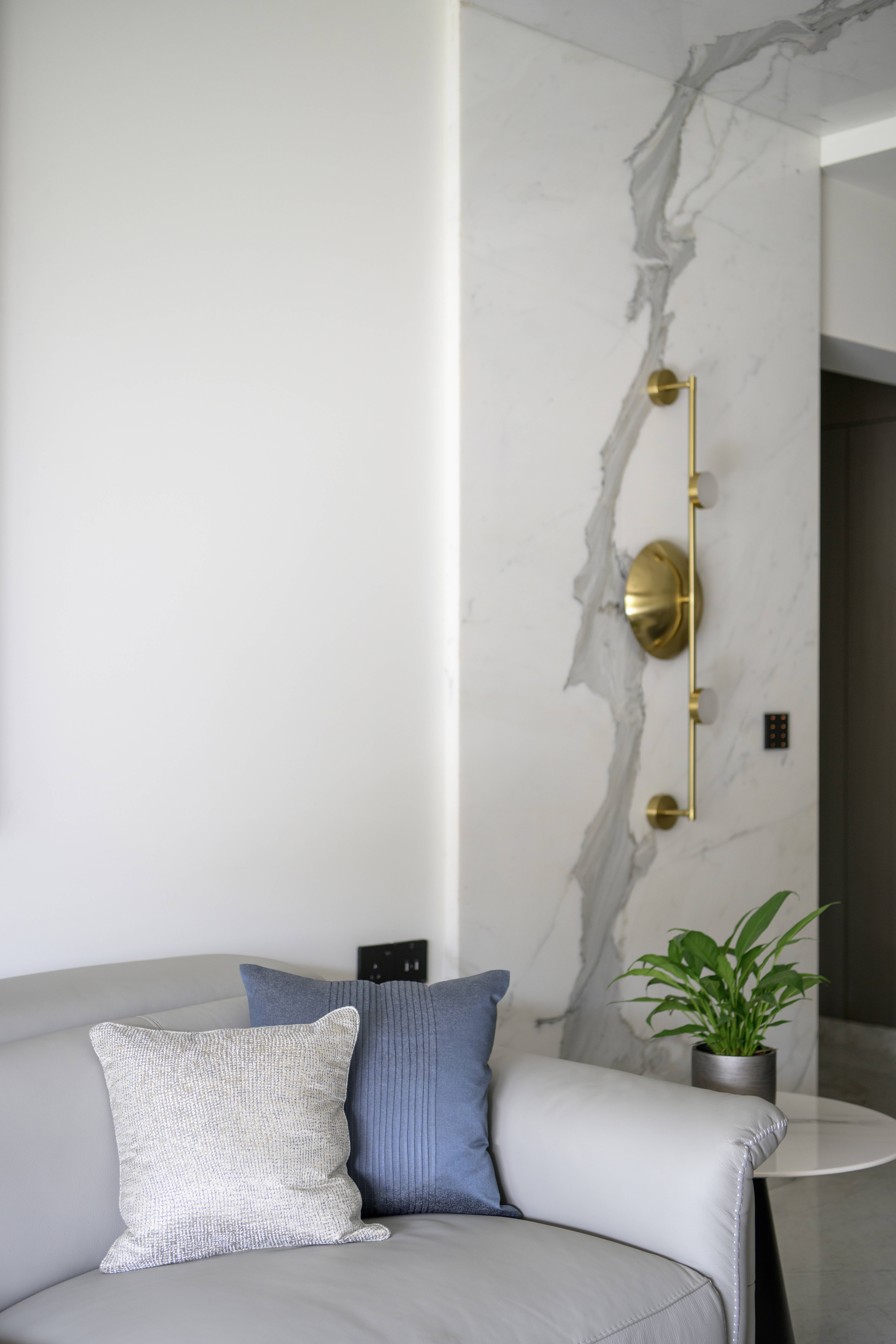This residence is designed as a serene, contemporary retreat where elegance meets comfort in every detail. A soft, neutral palette forms the foundation of the space, allowing luxurious textures, metallic accents, and carefully curated decor pieces to shine effortlessly. The living area is anchored by plush seating in muted tones, complemented by striking gold artwork and sculptural wall elements that add depth and sophistication.