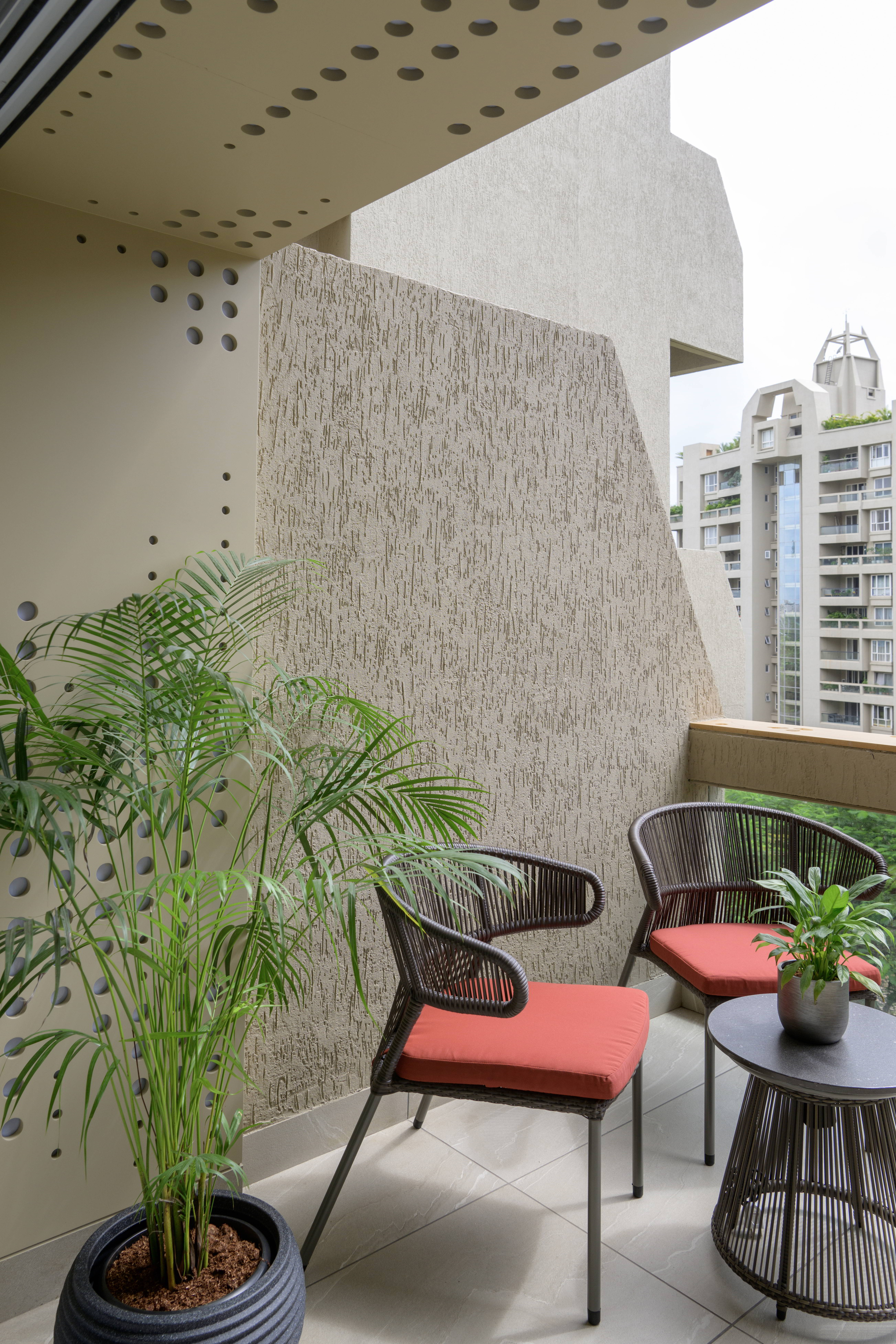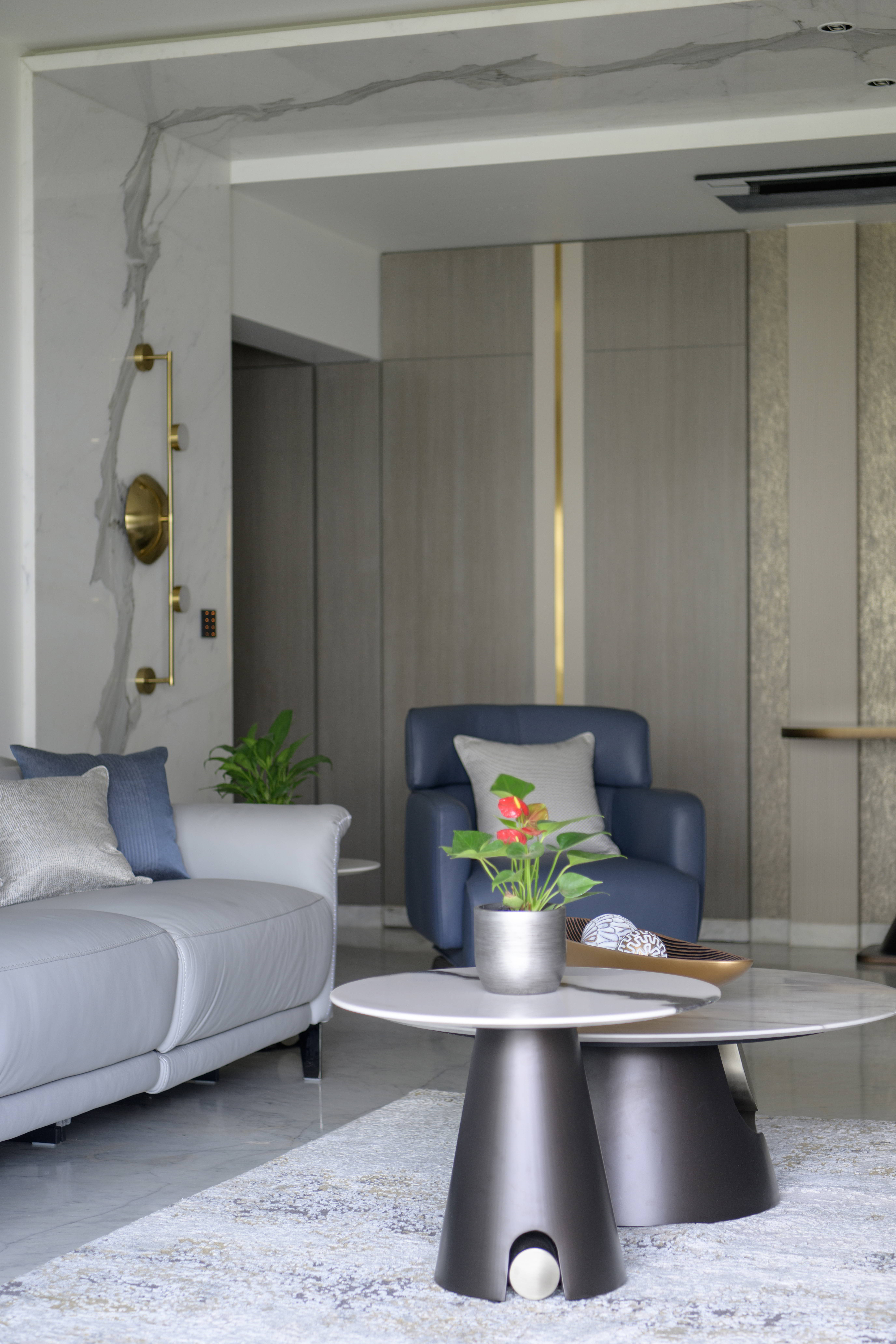 Subtle curves, layered materials, and warm lighting create an inviting ambiance, while hints of brass and marble lend a refined, modern touch. Thoughtful furniture selection including sleek accent chairs and organically shaped tables enhances both functionality and visual flow. Large windows with sheer drapes infuse the interiors with natural light, creating a calming atmosphere throughout the day.