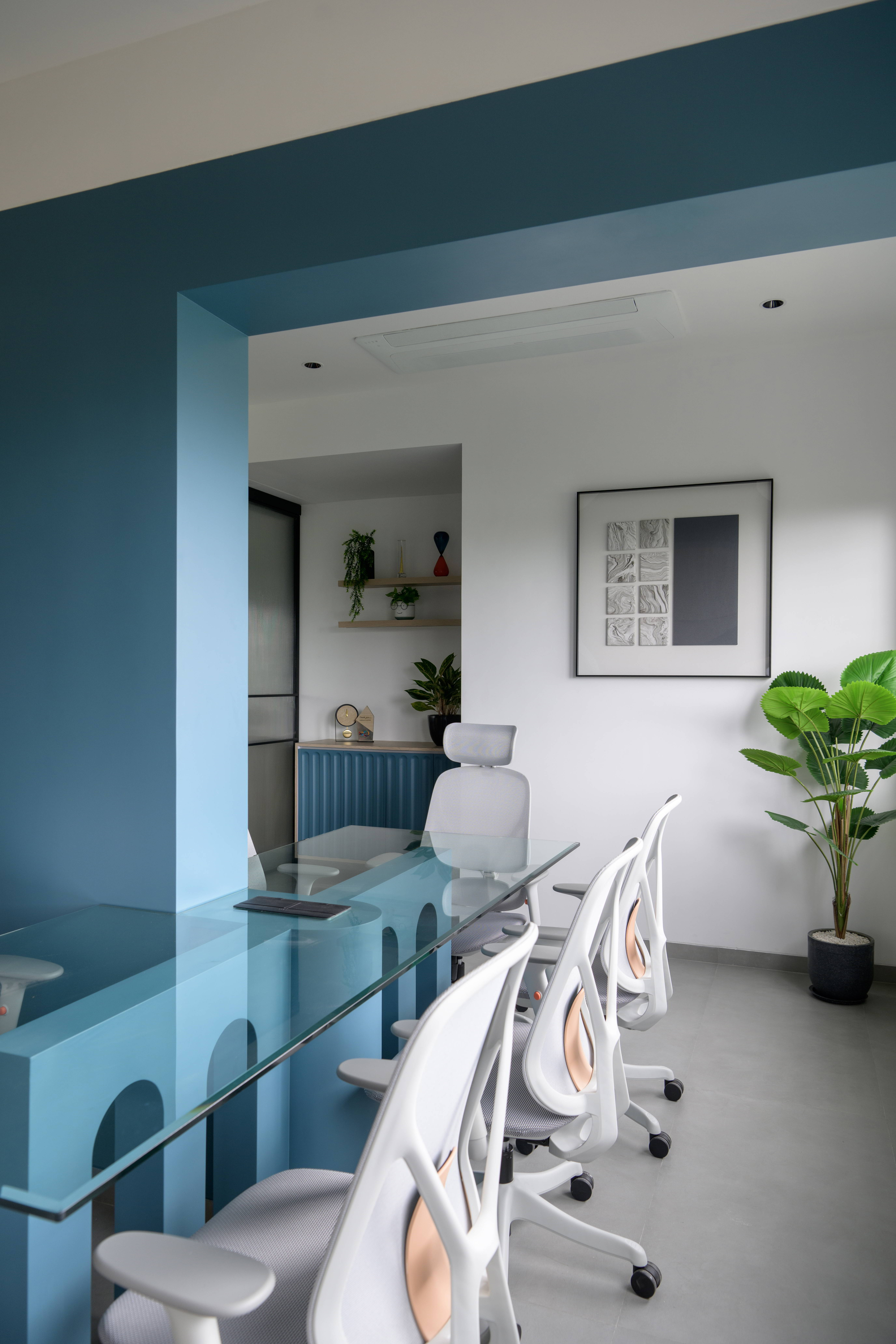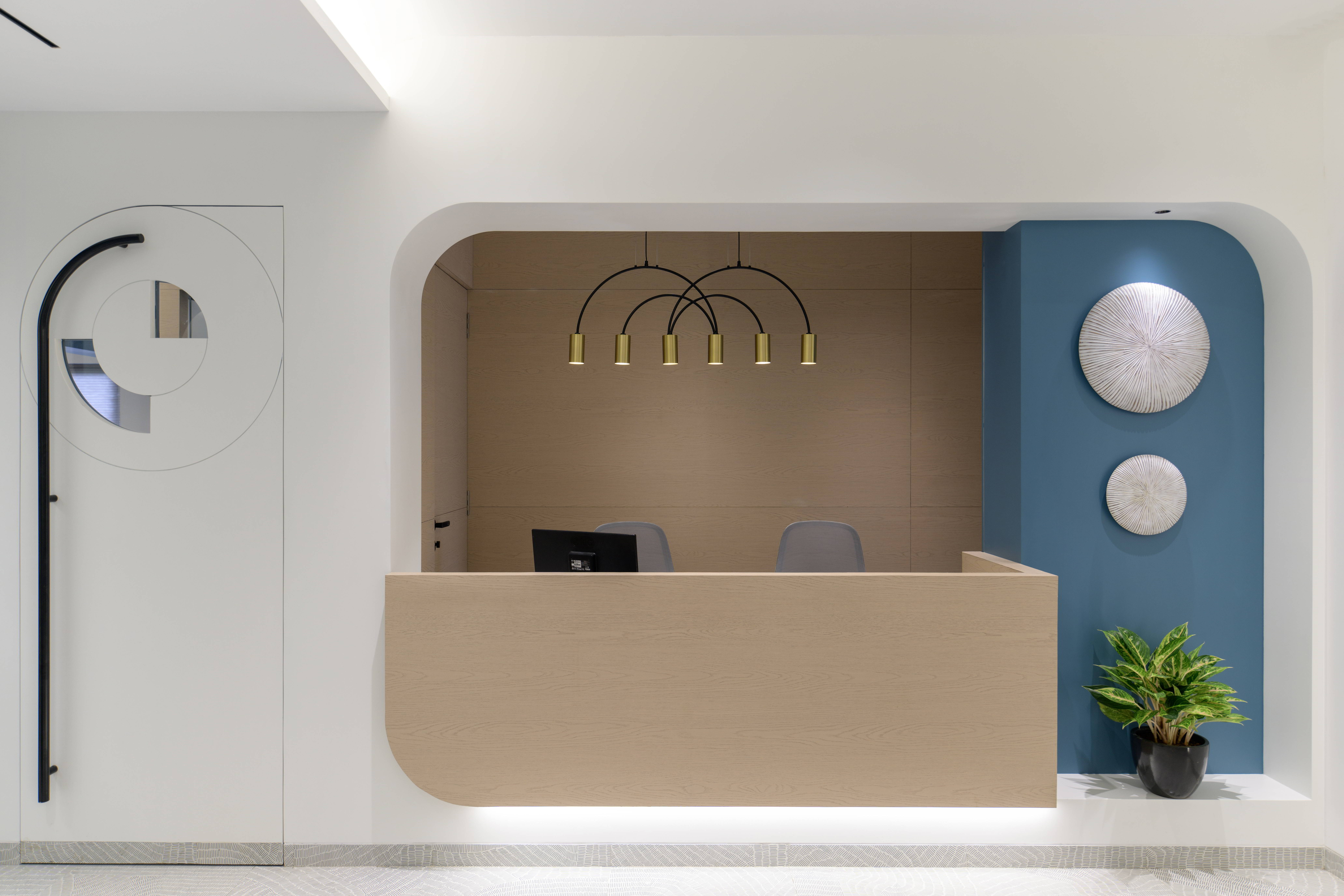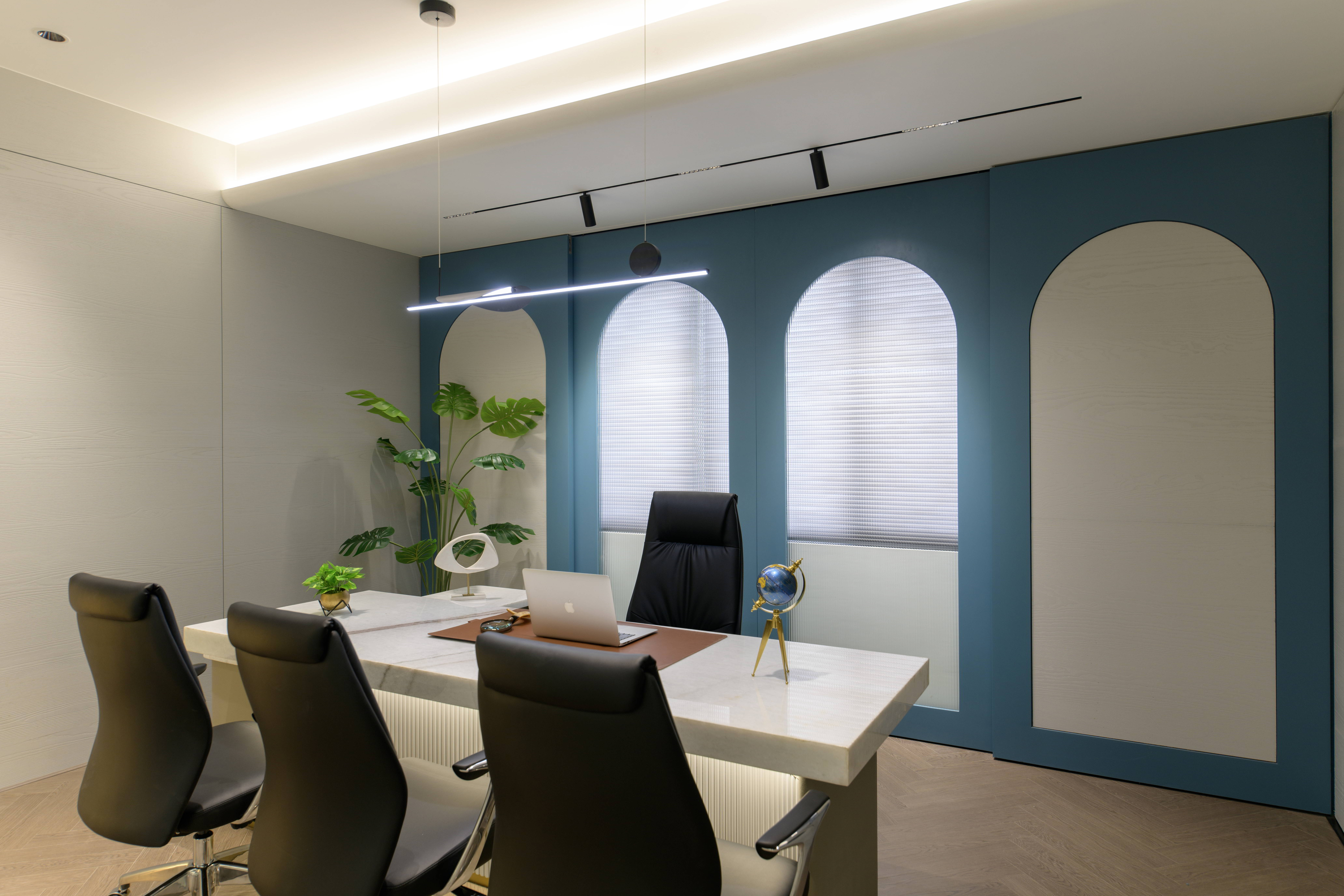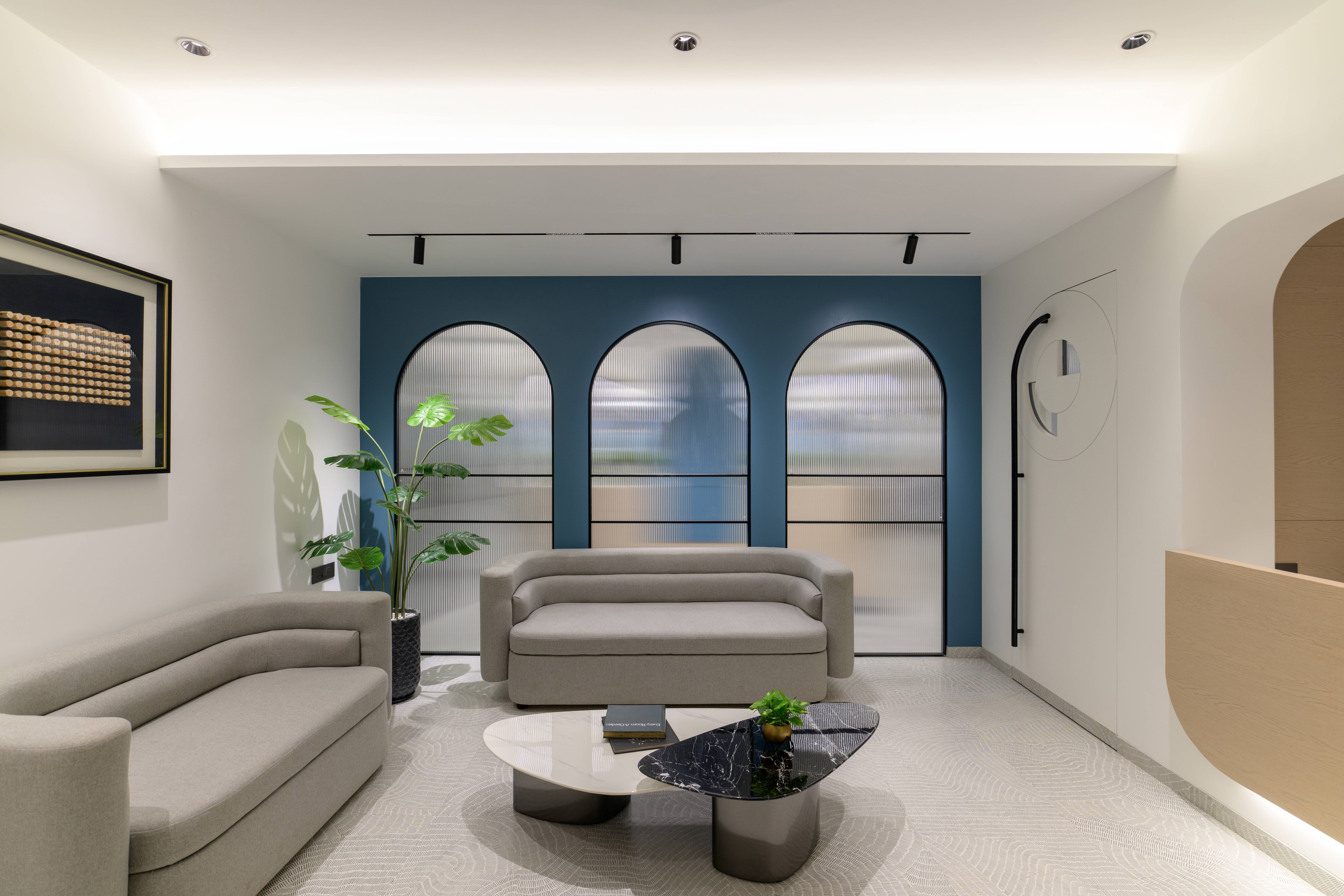 This thoughtfully designed office interior blends modern aesthetics with functional planning to create a calm, sophisticated, and performance driven workspace. The reception area sets the tone with its soft curves, refined material palette, and warm lighting, offering an inviting first impression. Arched forms, textured panels, and muted blue accents add character while maintaining a professional appeal.