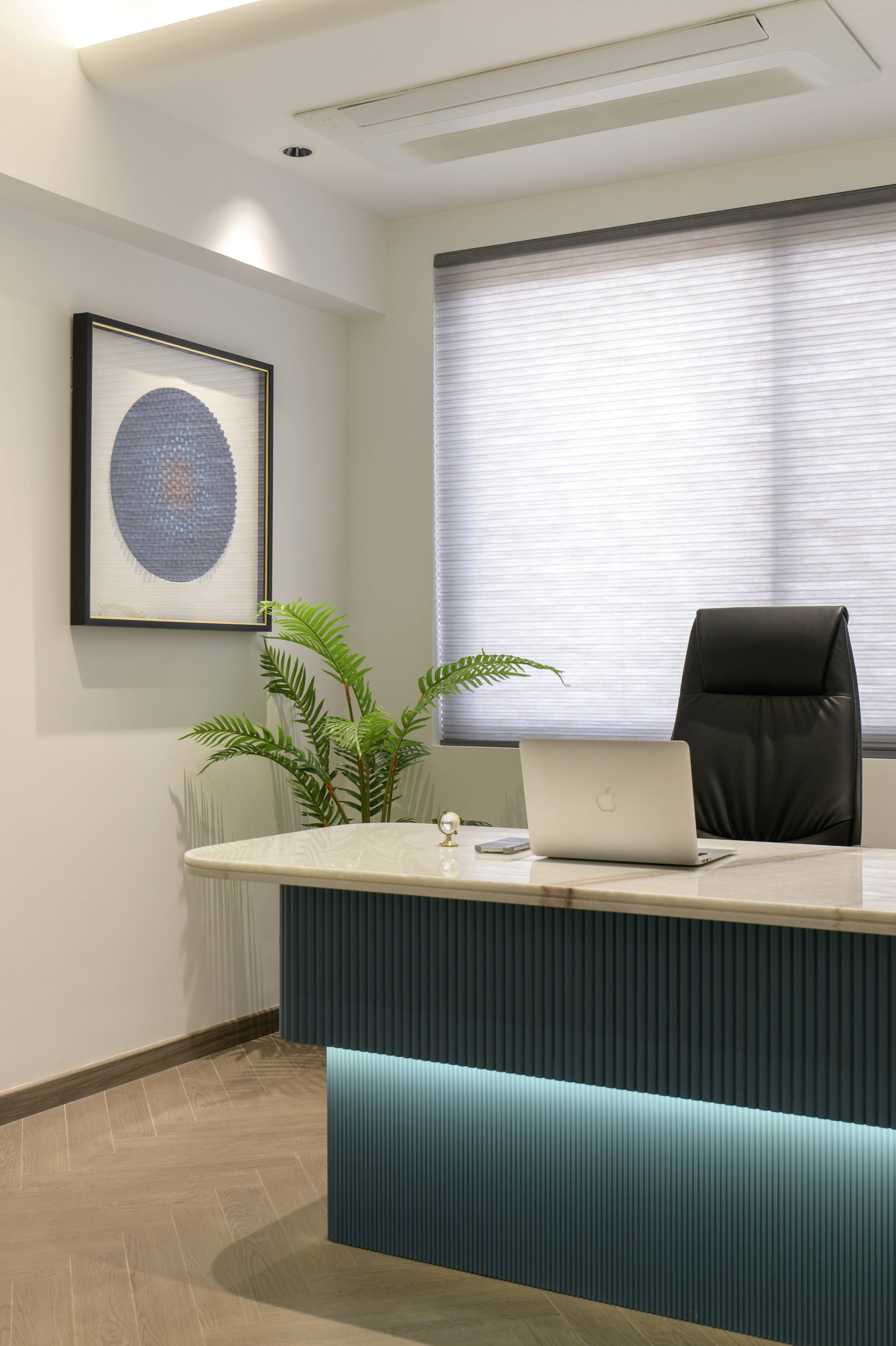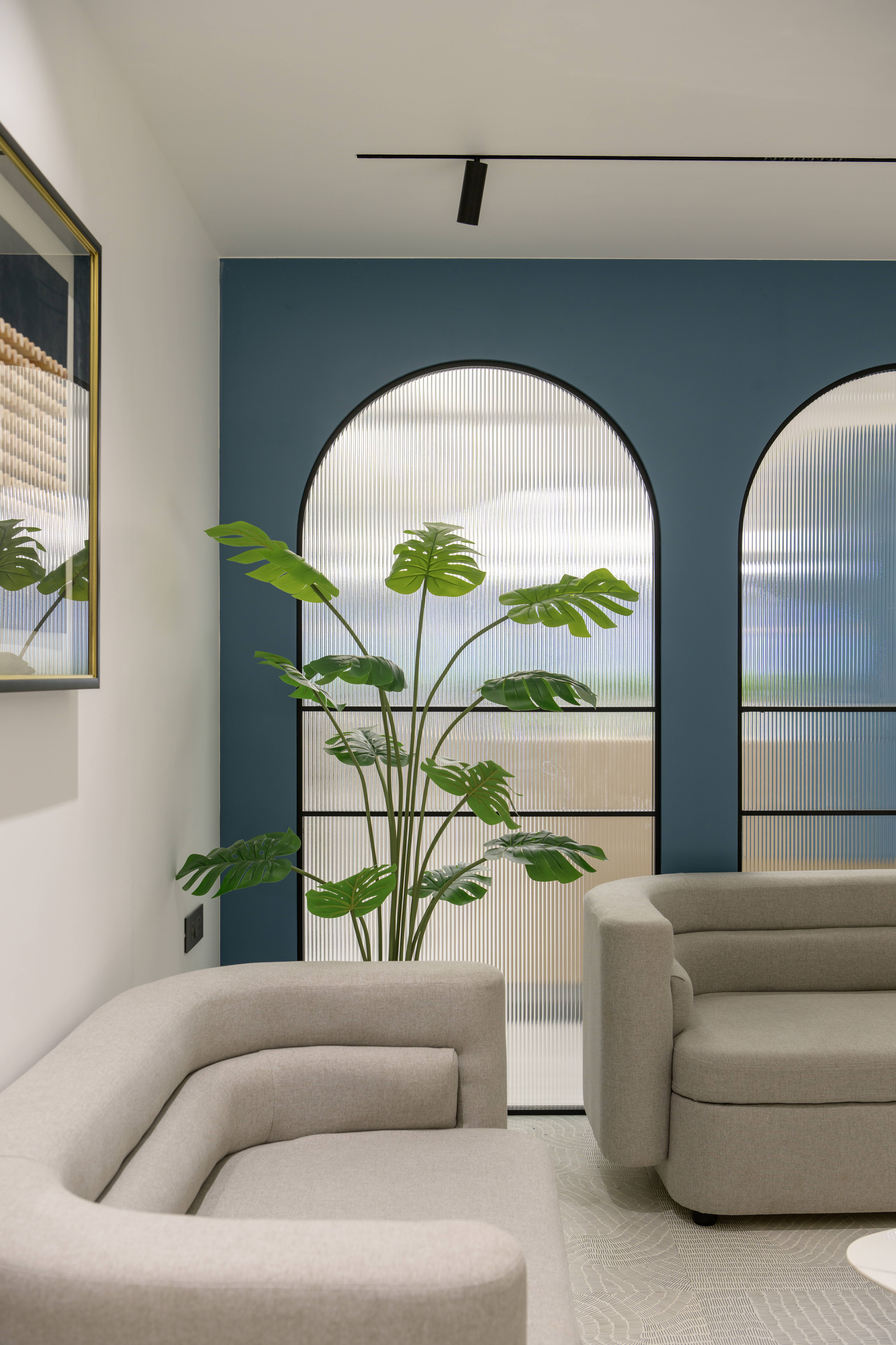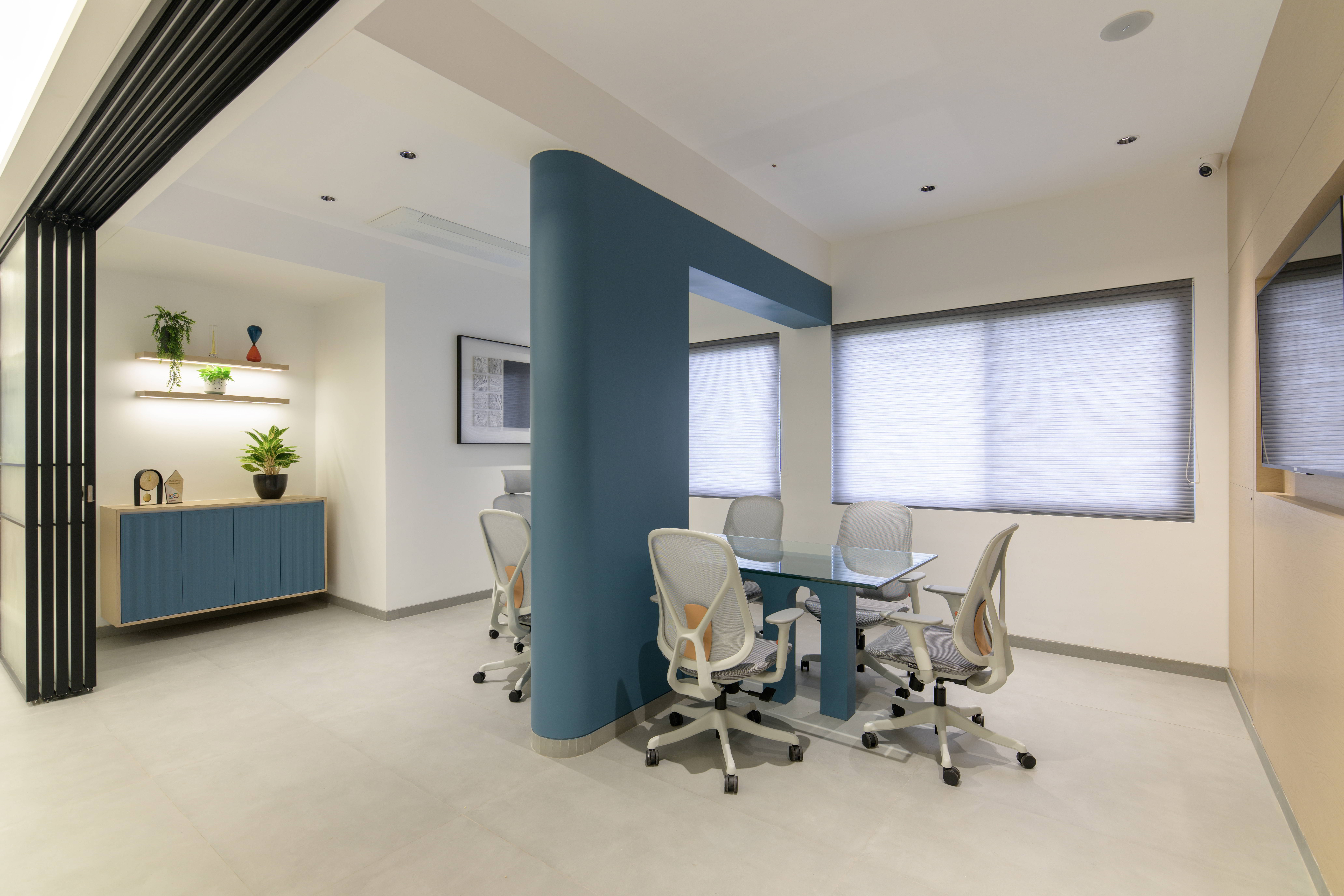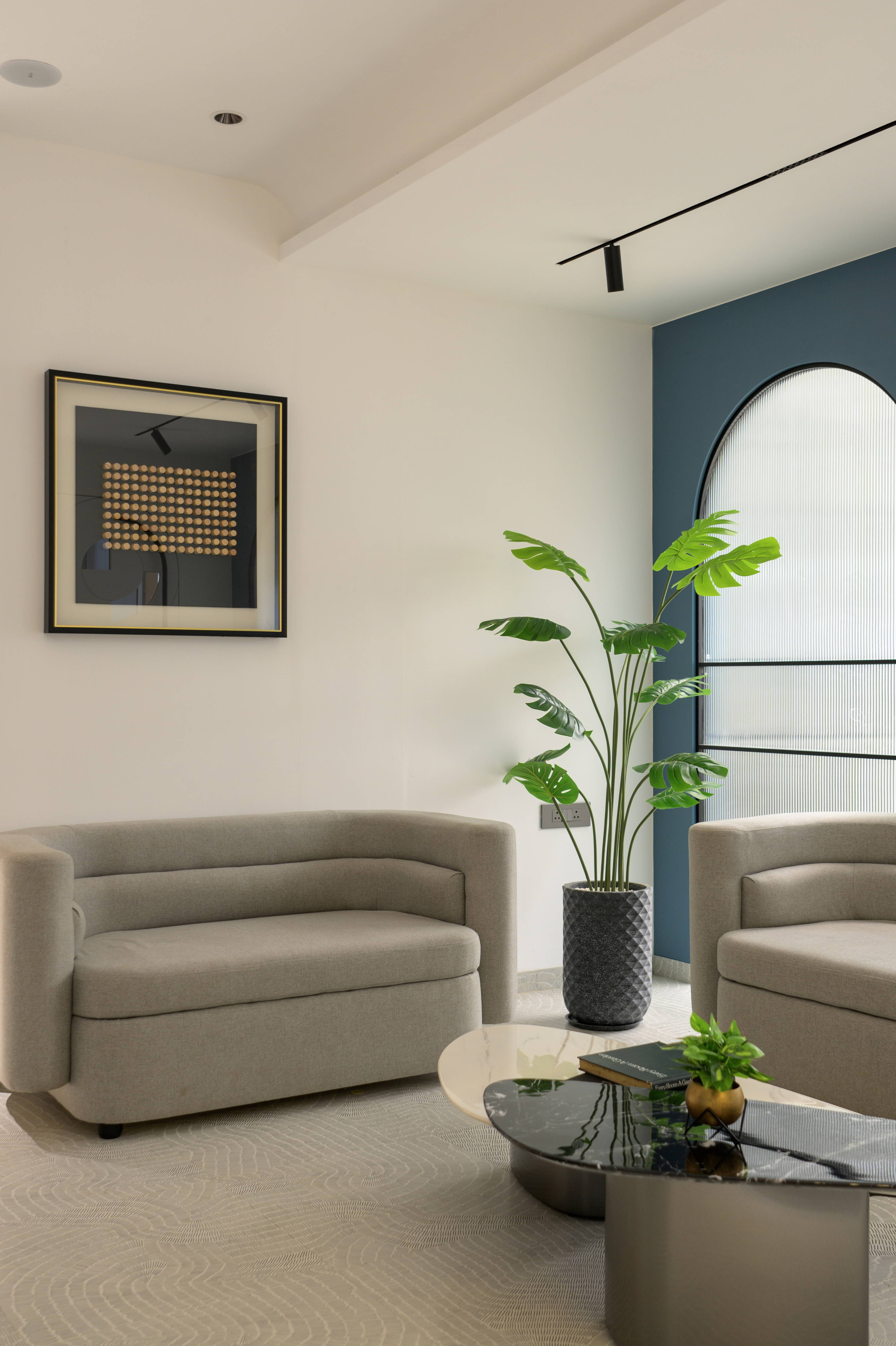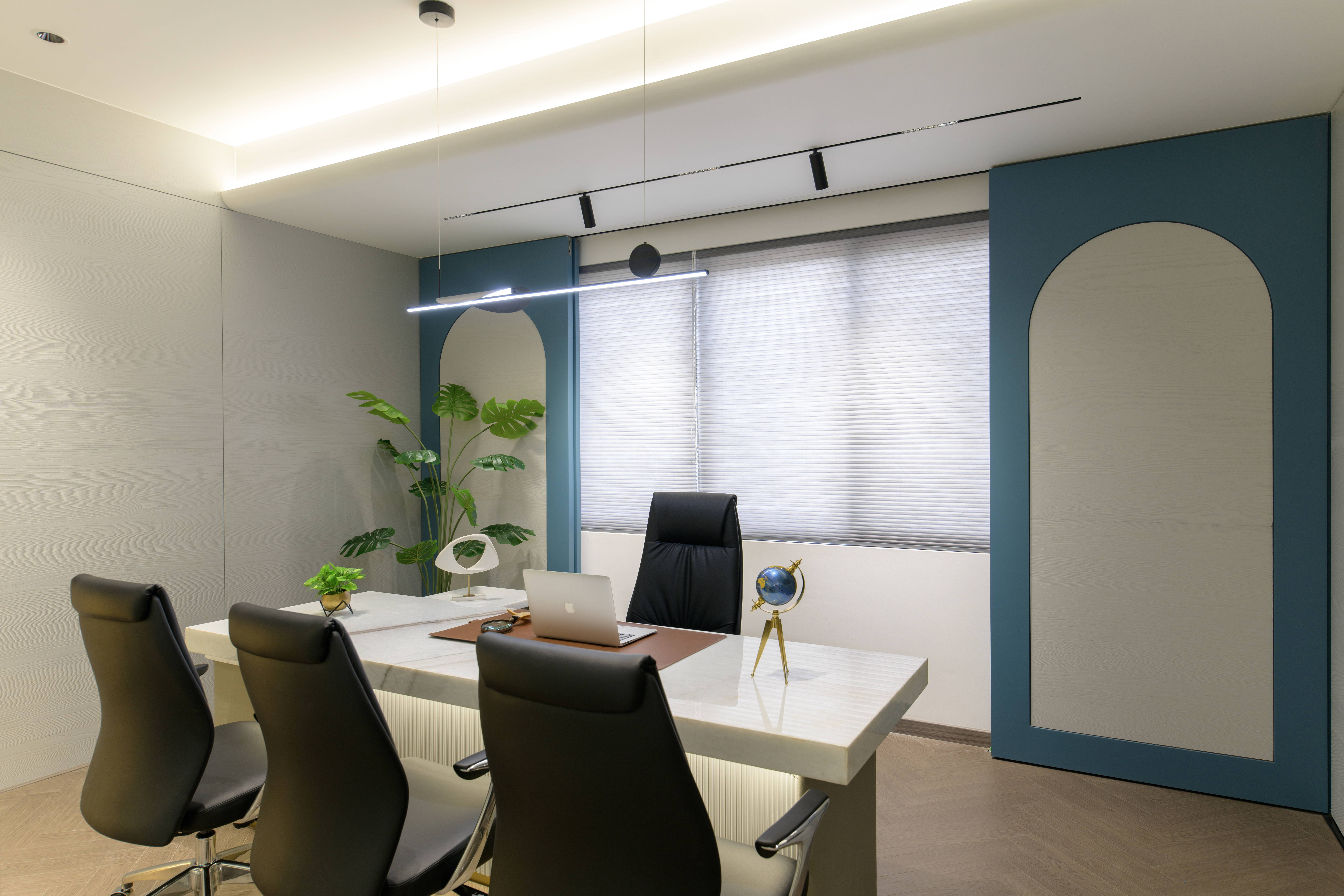 This thoughtfully designed office interior blends modern aesthetics with functional planning to create a calm, sophisticated, and performance driven workspace. The reception area sets the tone with its soft curves, refined material palette, and warm lighting, offering an inviting first impression. Arched forms, textured panels, and muted blue accents add character while maintaining a professional appeal.