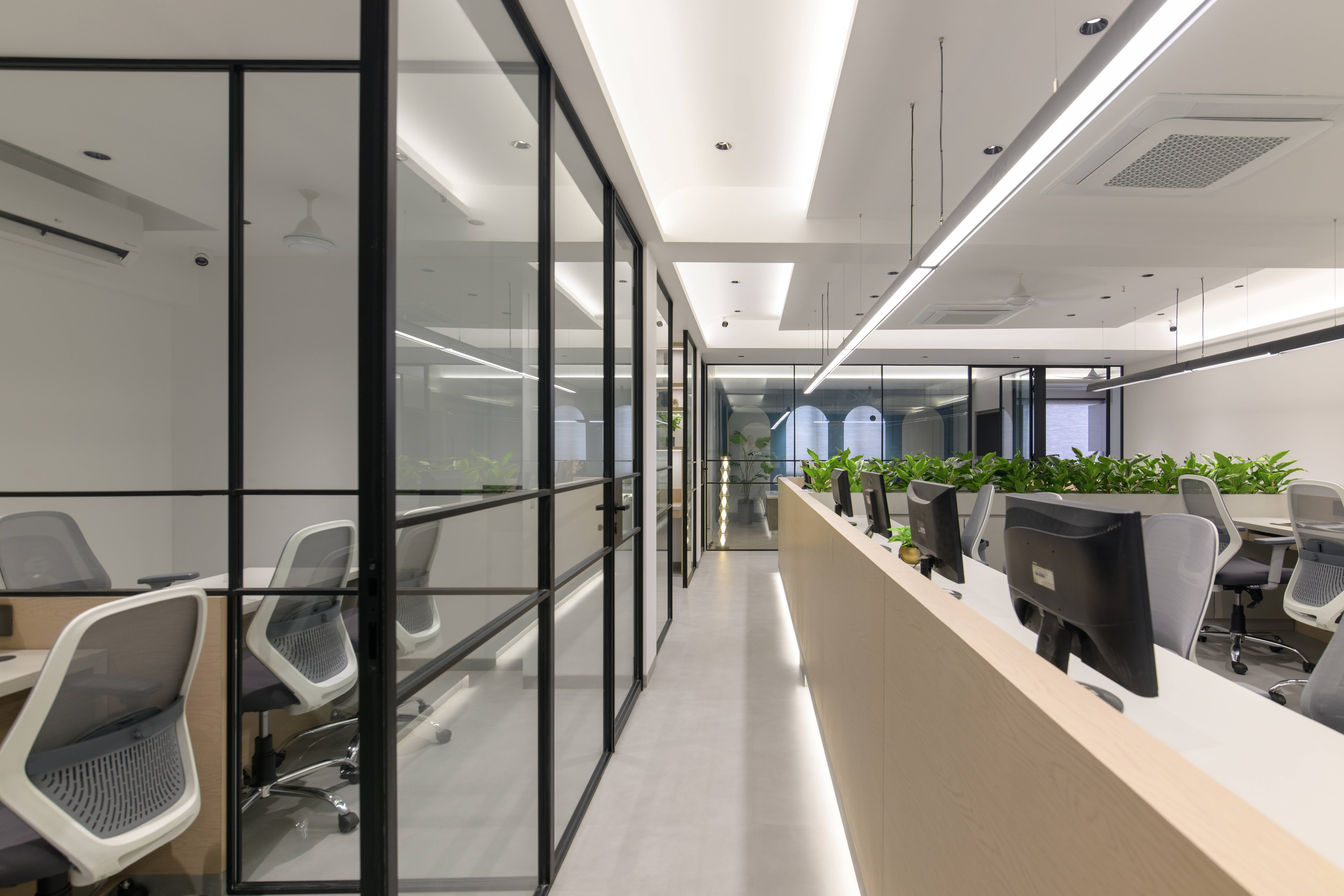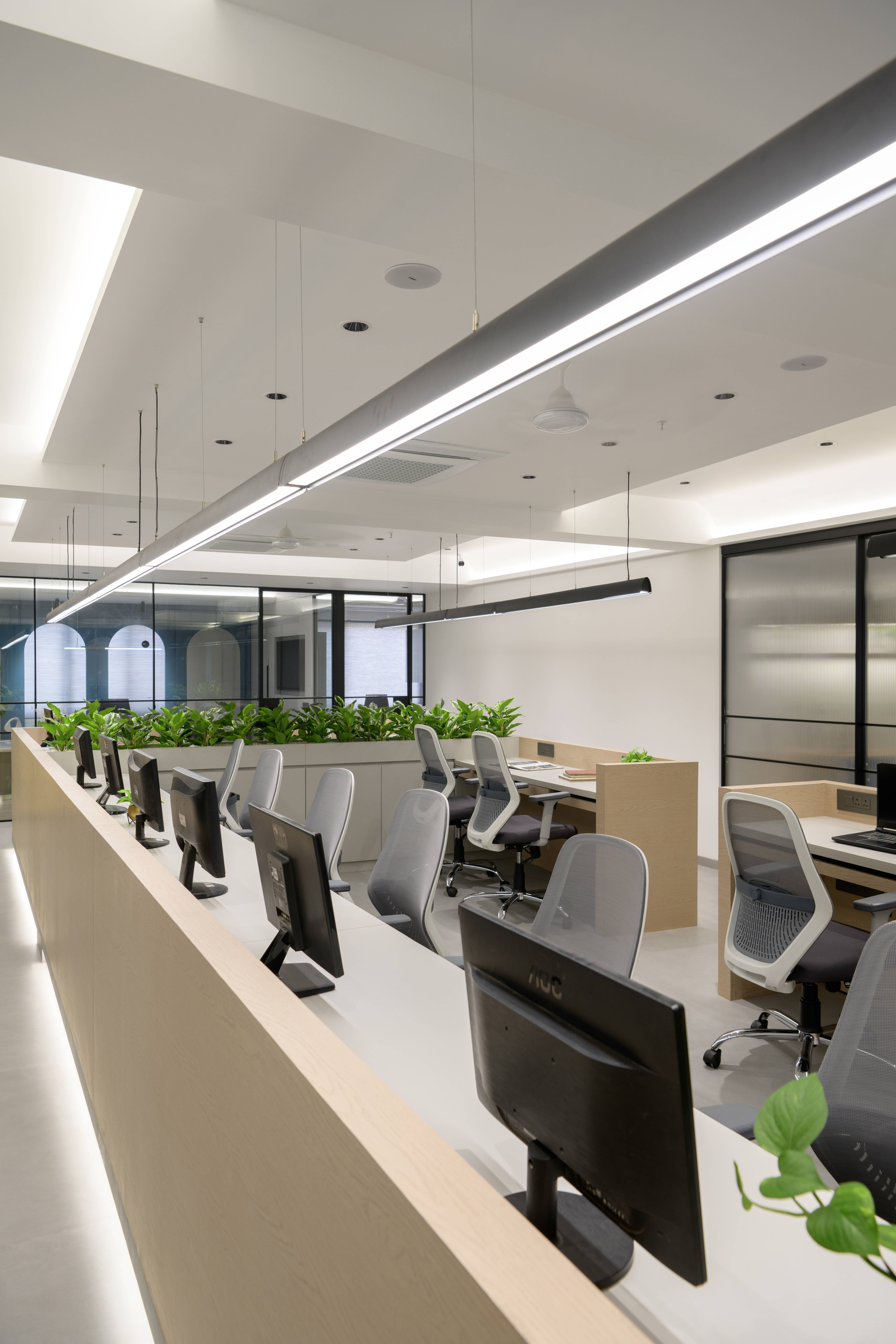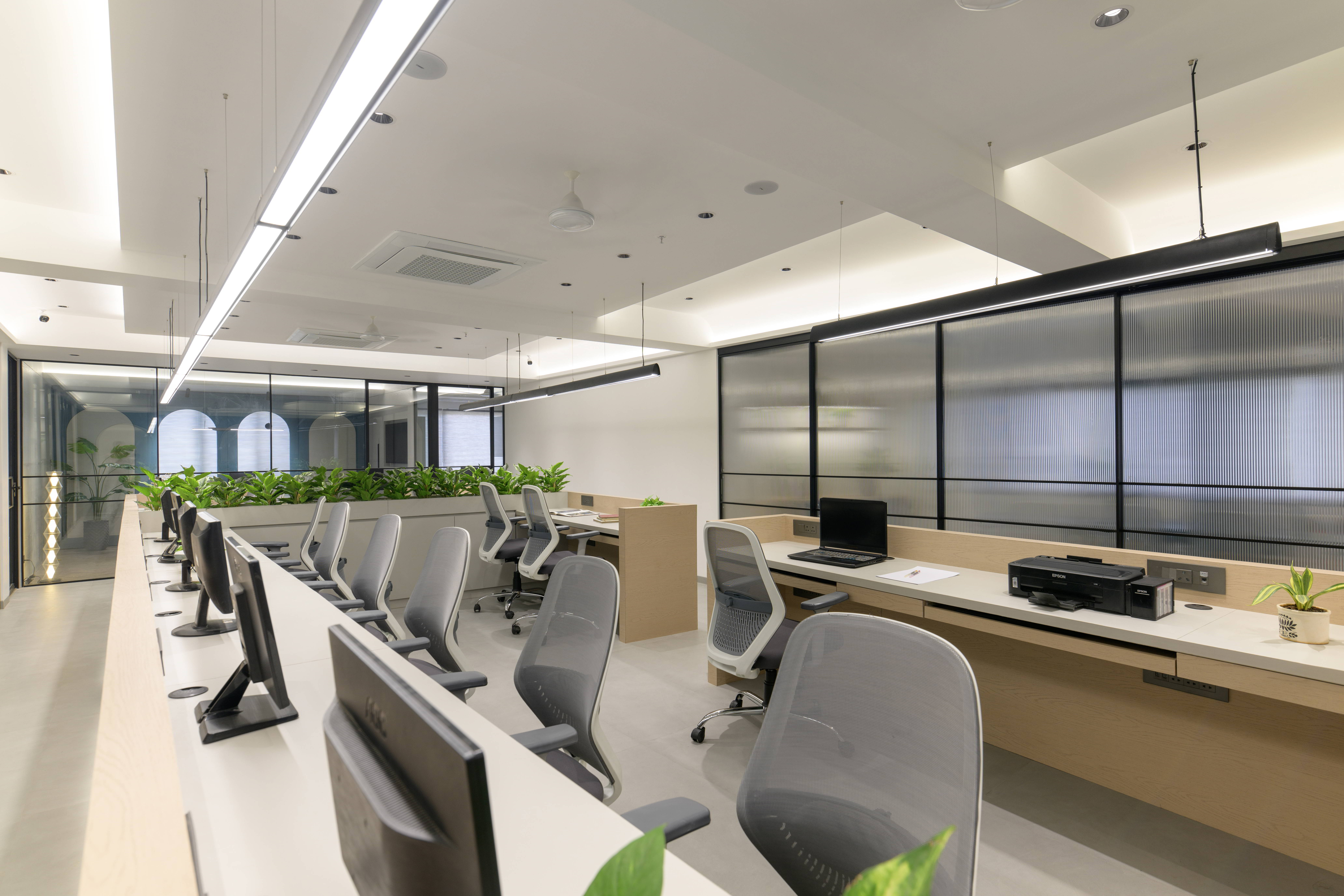 The central workstations are designed with ergonomics and efficiency in mind. Light-toned finishes, integrated planters, and linear lighting create a fresh and uplifting environment that supports focused work. Thoughtful zoning ensures collaborative areas, private cabins, and circulation paths coexist harmoniously.