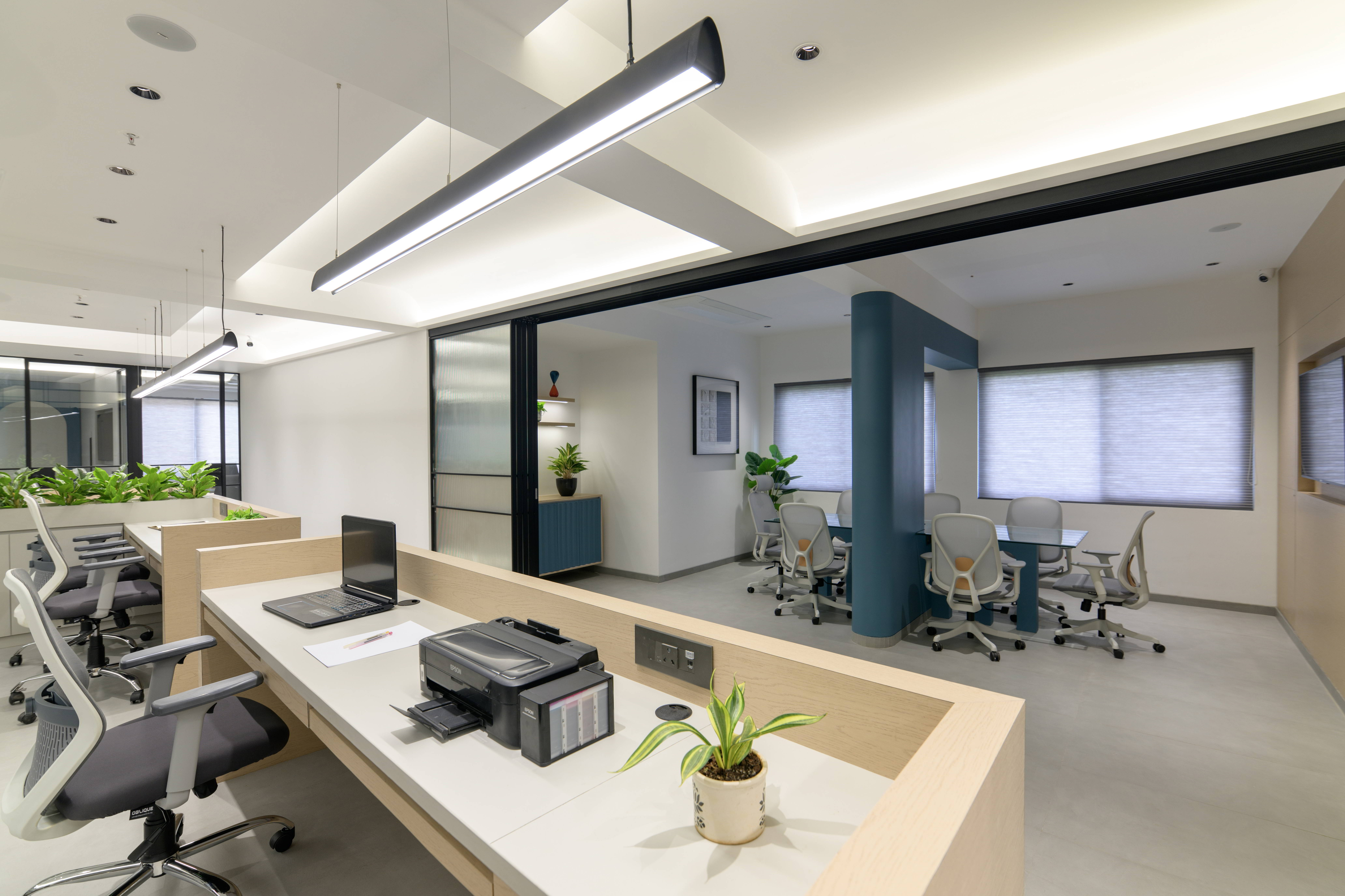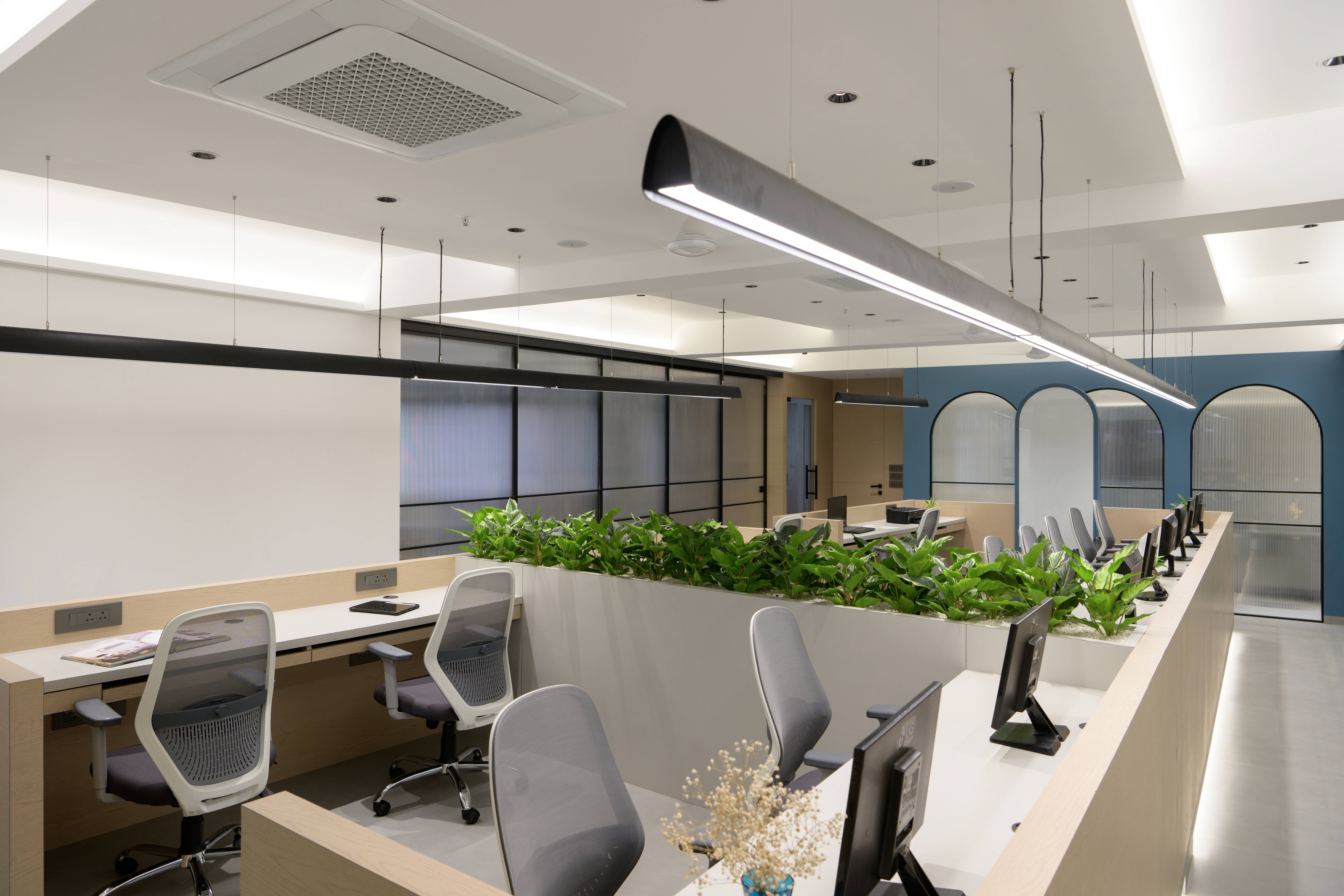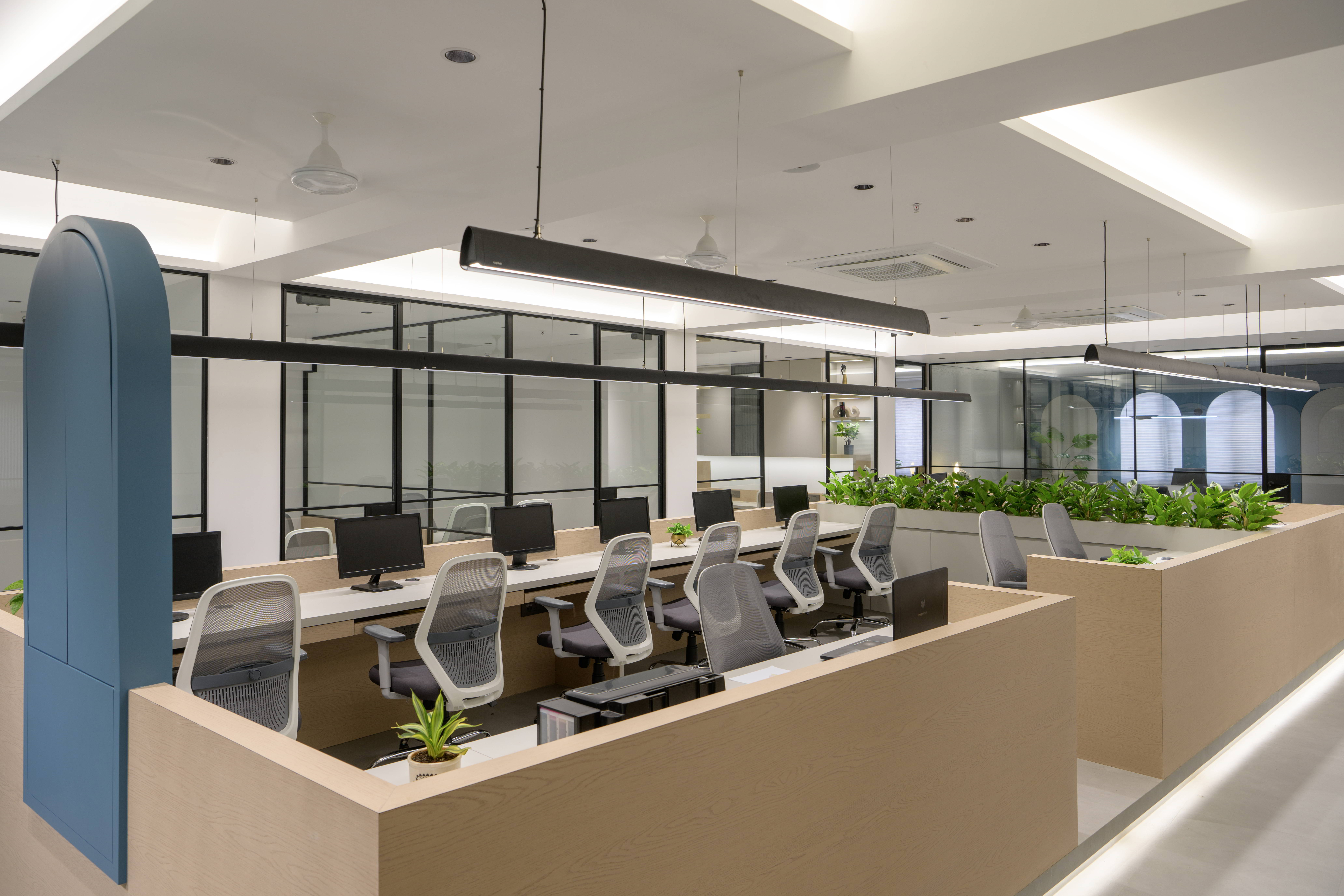 The central workstations are designed with ergonomics and efficiency in mind. Light-toned finishes, integrated planters, and linear lighting create a fresh and uplifting environment that supports focused work. Thoughtful zoning ensures collaborative areas, private cabins, and circulation paths coexist harmoniously.