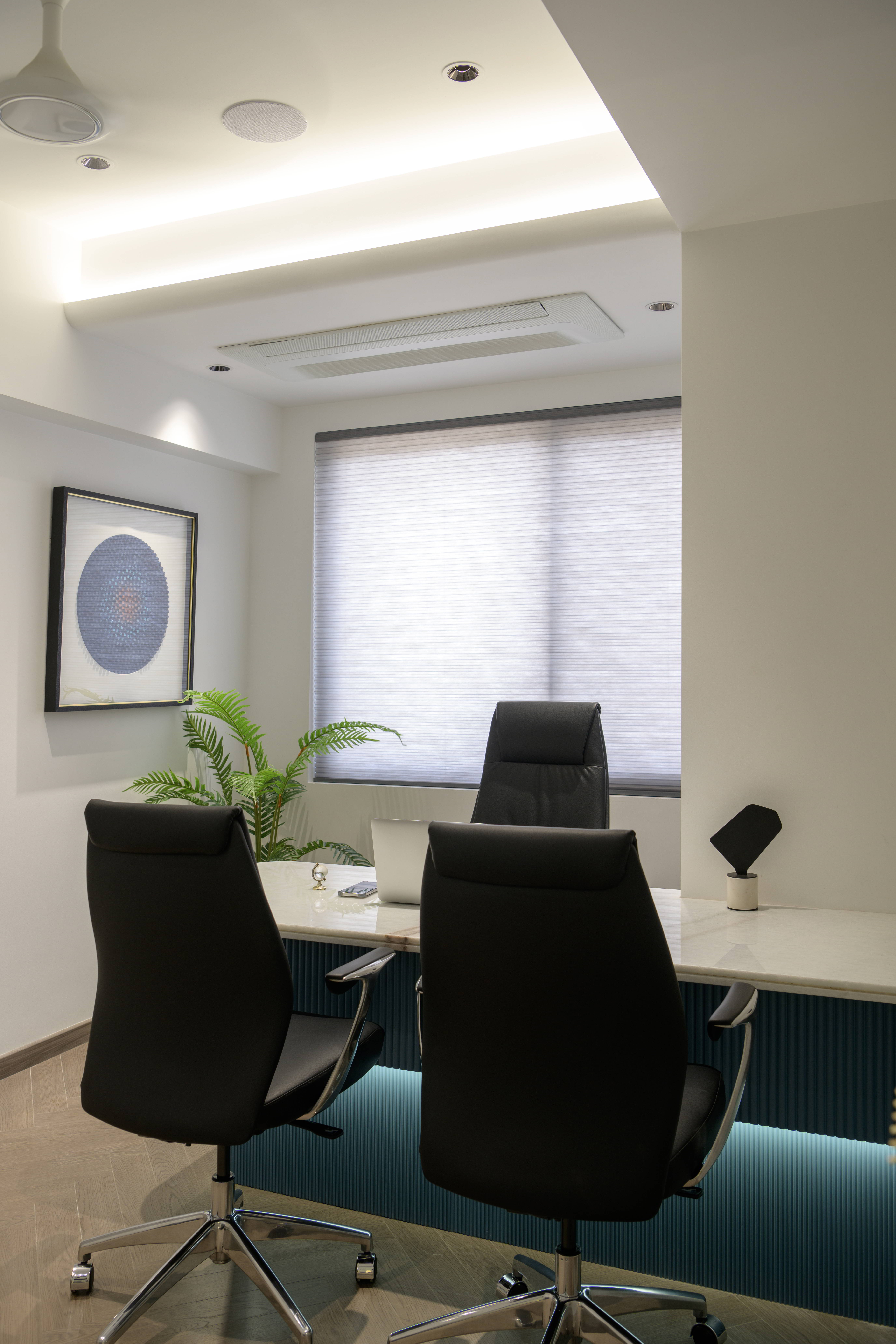 A seamless transition from the entrance corridor to the main workspace is achieved through clean lines, concealed lighting, and subtle sculptural detailing. The layout prioritizes openness, ensuring uninterrupted circulation and visual continuity. Glass partitions maintain privacy without compromising transparency, allowing natural light to flow freely throughout the space.